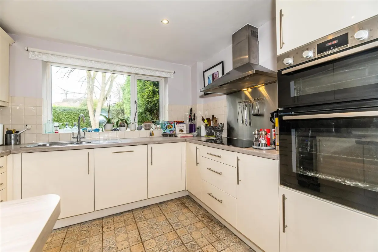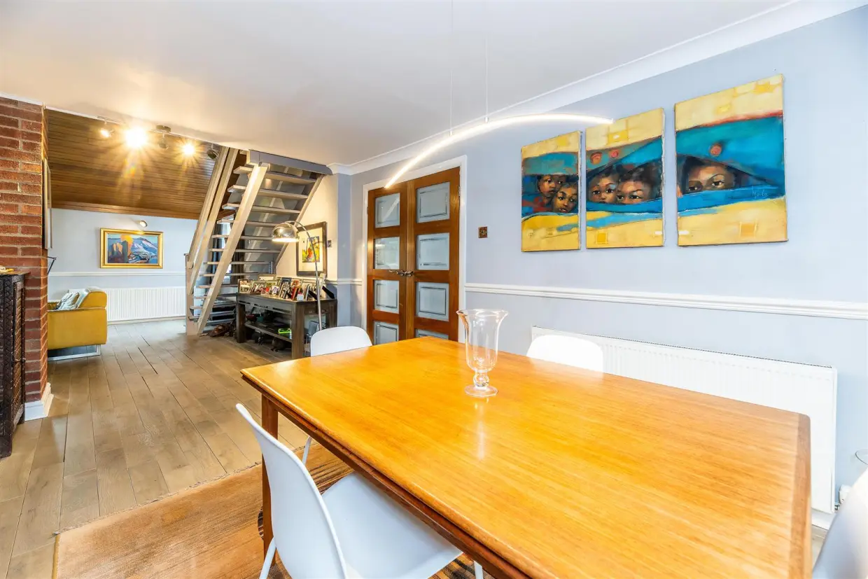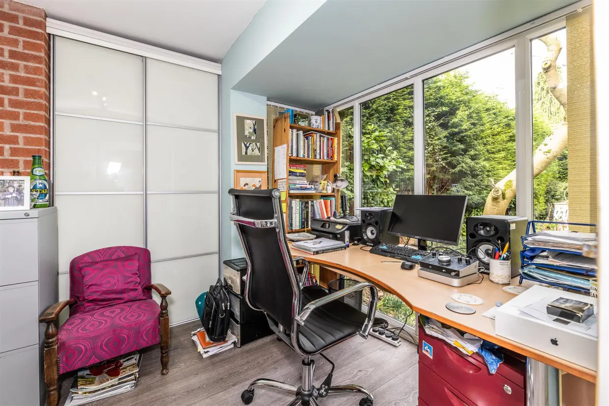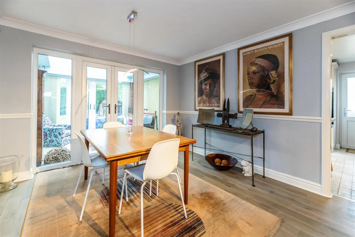 The open plan dining area flows seamlessly into a charming sunroom, offering picturesque views of the established rear garden. A separate study also enjoys garden views, providing a peaceful workspace. The separate modern fitted kitchen is well-equipped and offers integrated appliances.
