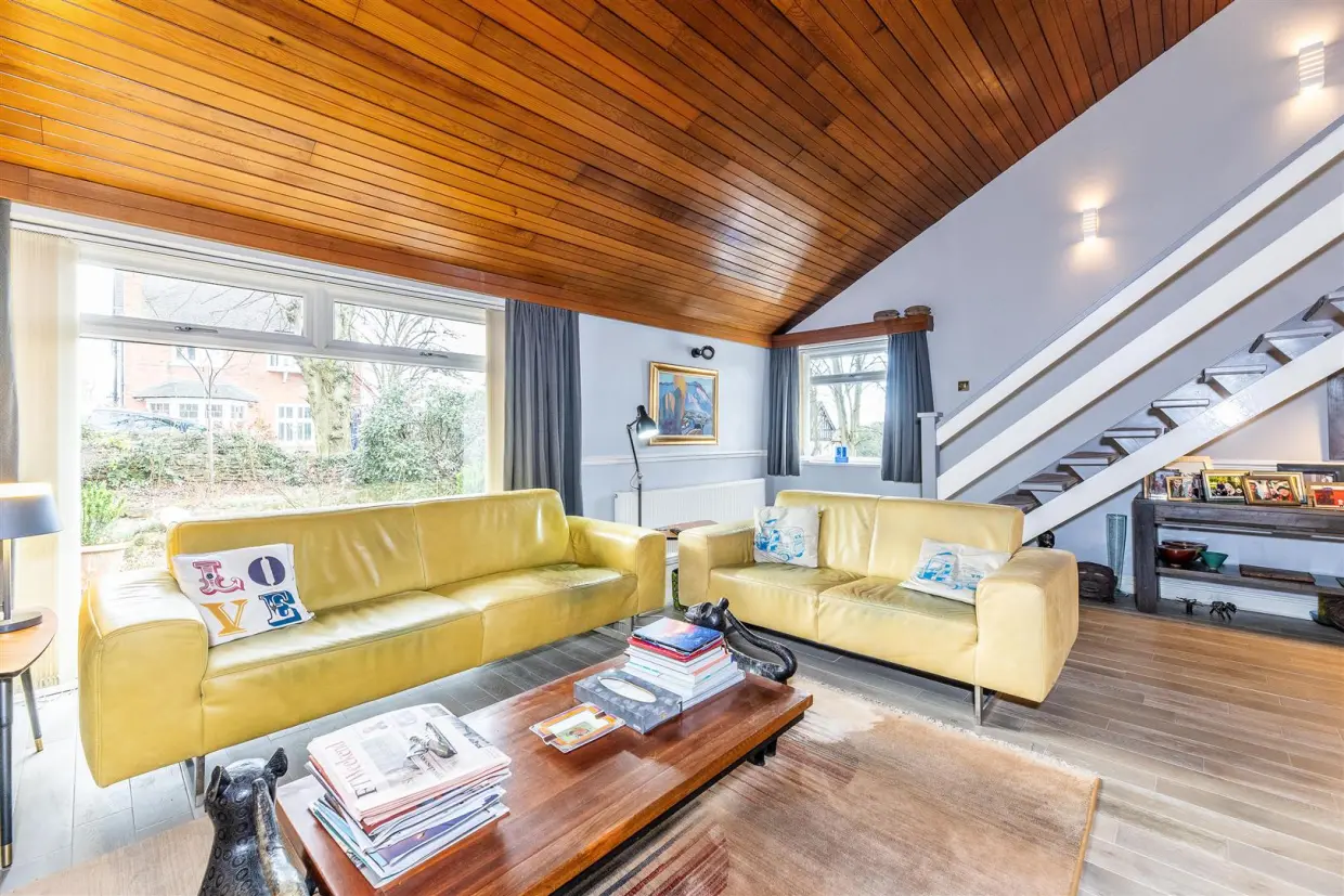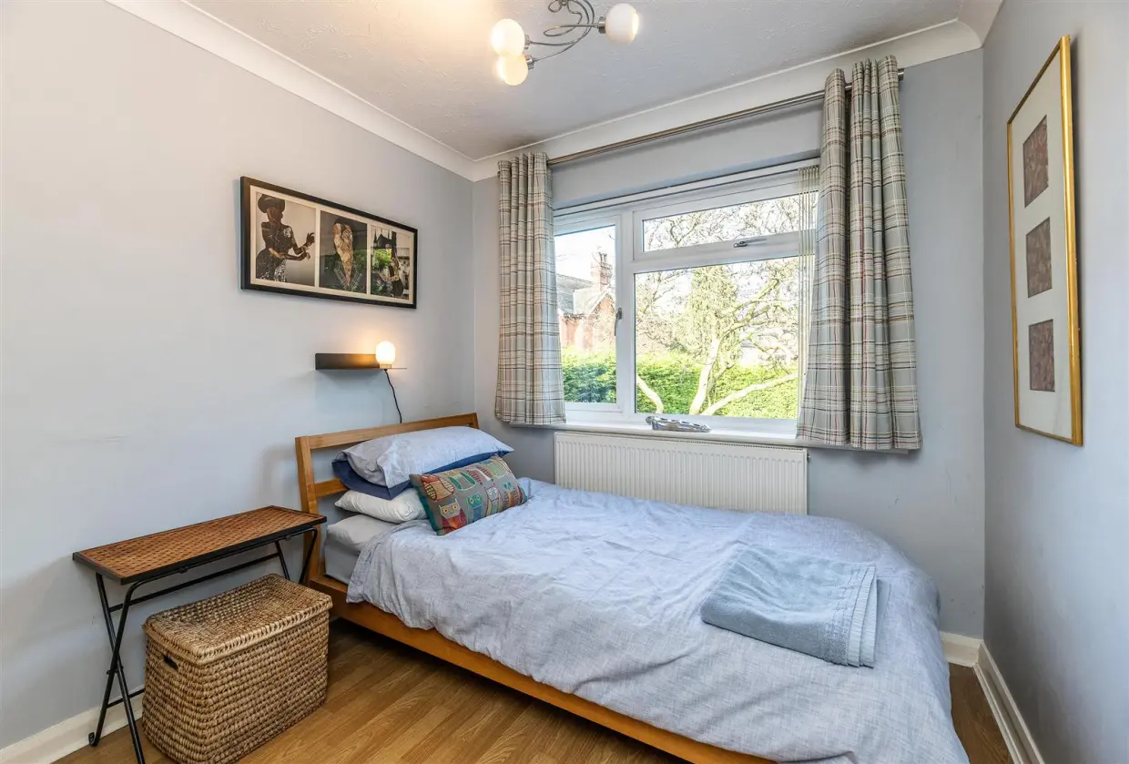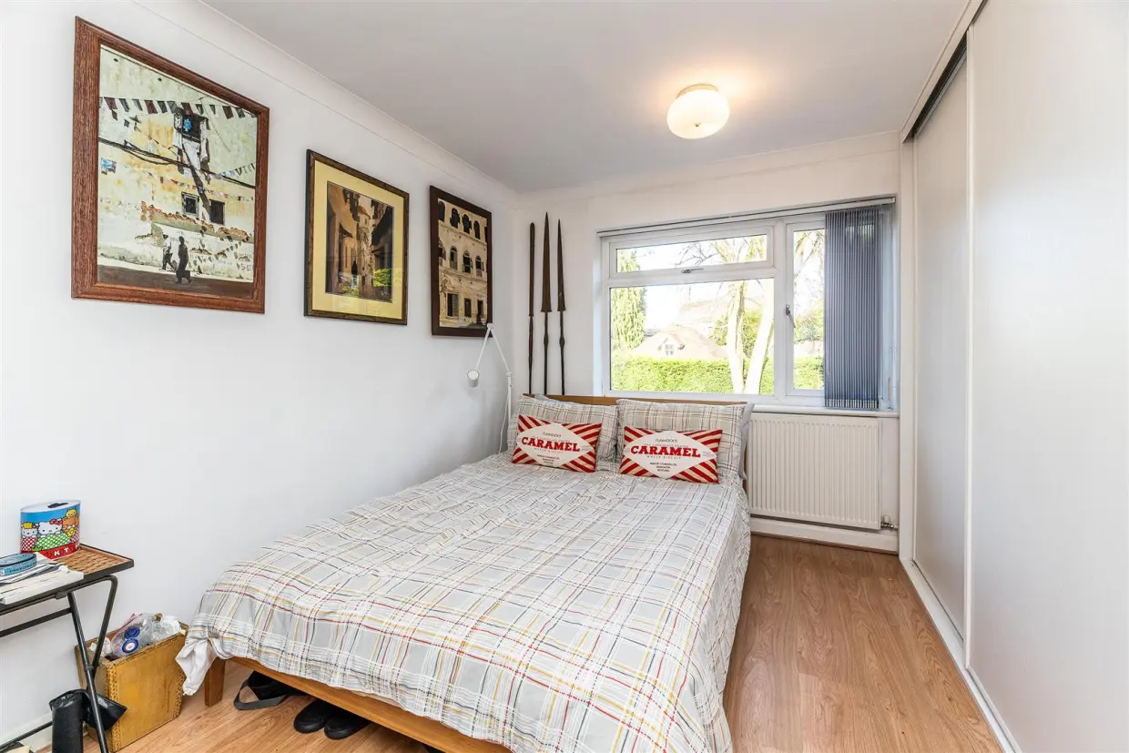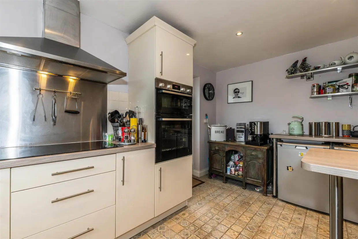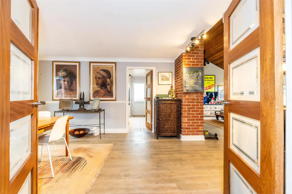 The open plan dining area flows seamlessly into a charming sunroom, offering picturesque views of the established rear garden. A separate study also enjoys garden views, providing a peaceful workspace. The separate modern fitted kitchen is well-equipped and offers integrated appliances.