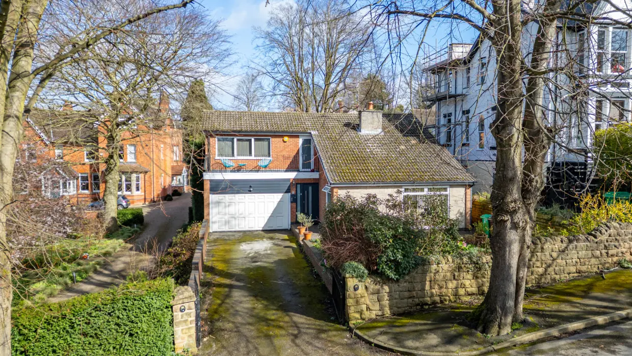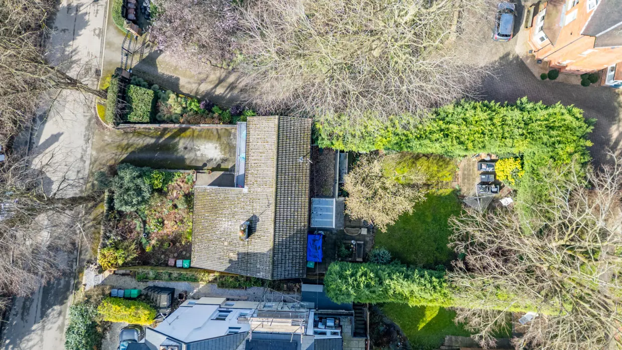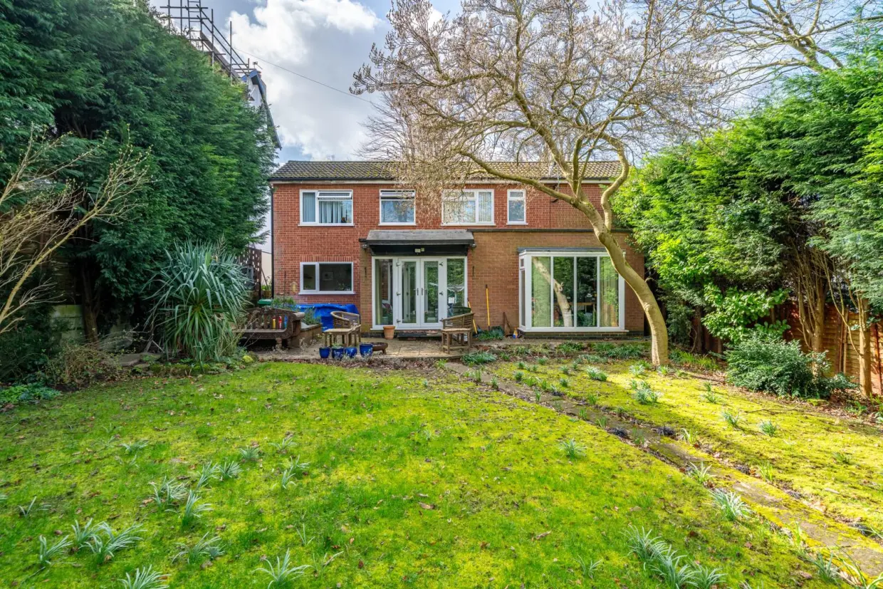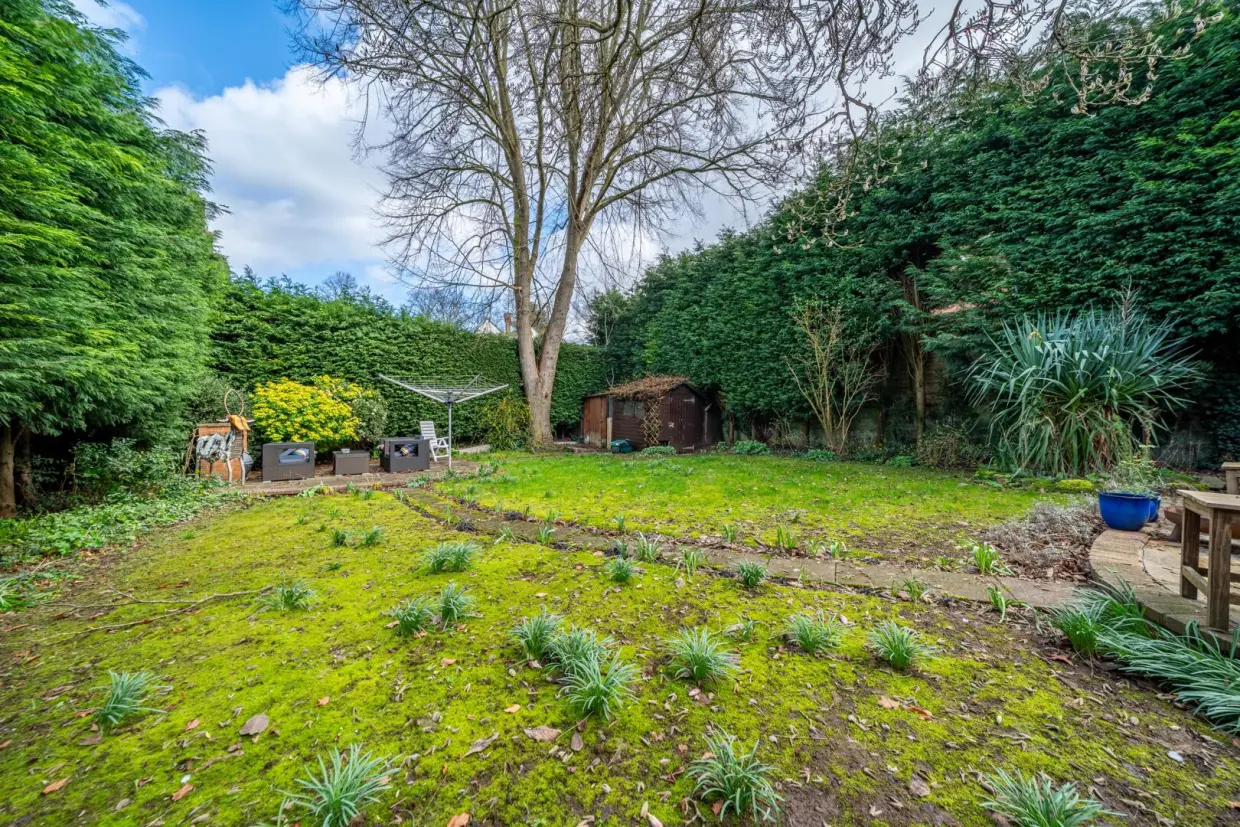 The property is set within an established rear garden, predominantly laid to lawn, providing a serene retreat. A private driveway offers off-road parking, complemented by the large garage for additional storage or vehicle space.