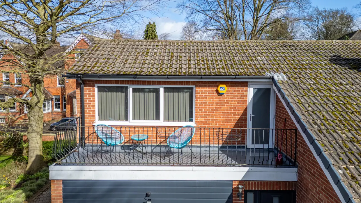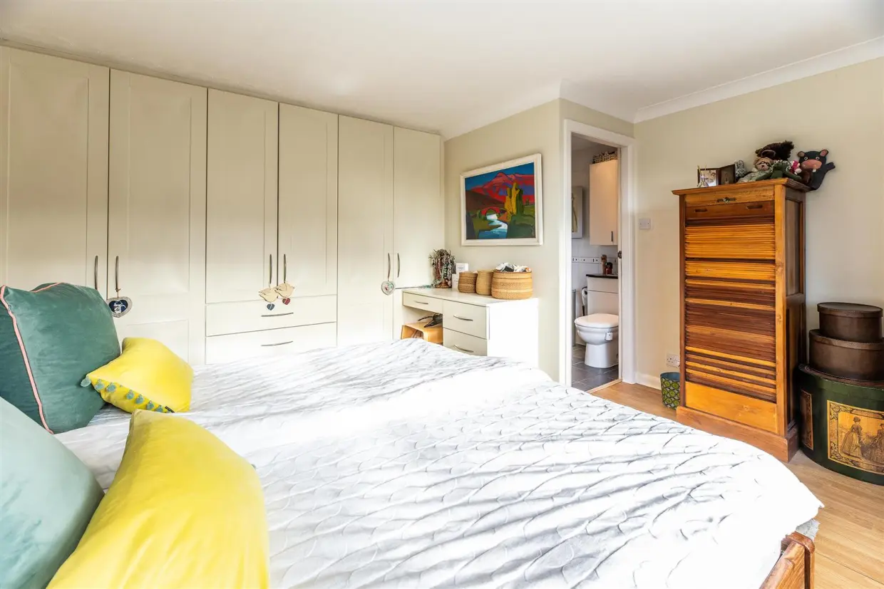 Upstairs, the property features three well-proportioned bedrooms, all with fitted wardrobes. The master suite benefits from an en-suite shower room and access to a private balcony, perfect for enjoying morning coffee.