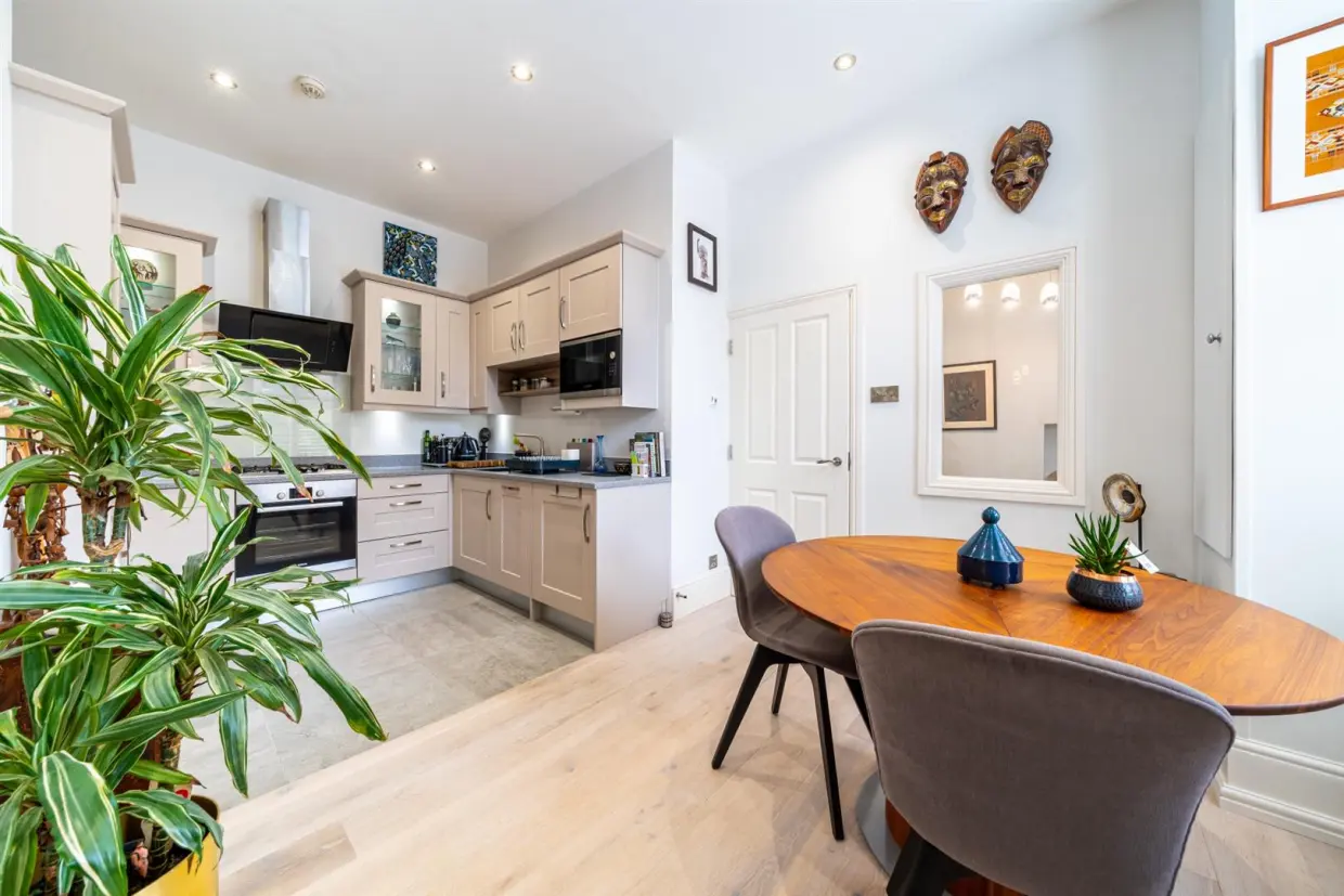 The apartment is beautifully presented, showcasing a thoughtful blend of period charm and modern design. A private, split-level entrance hall creates an immediate sense of space and character, with a window allowing natural light and useful under-stairs storage enhancing functionality.