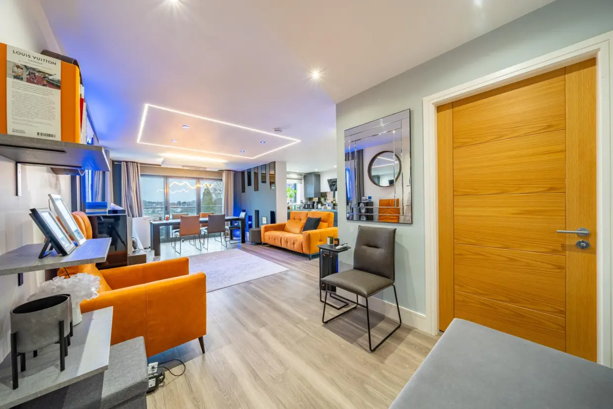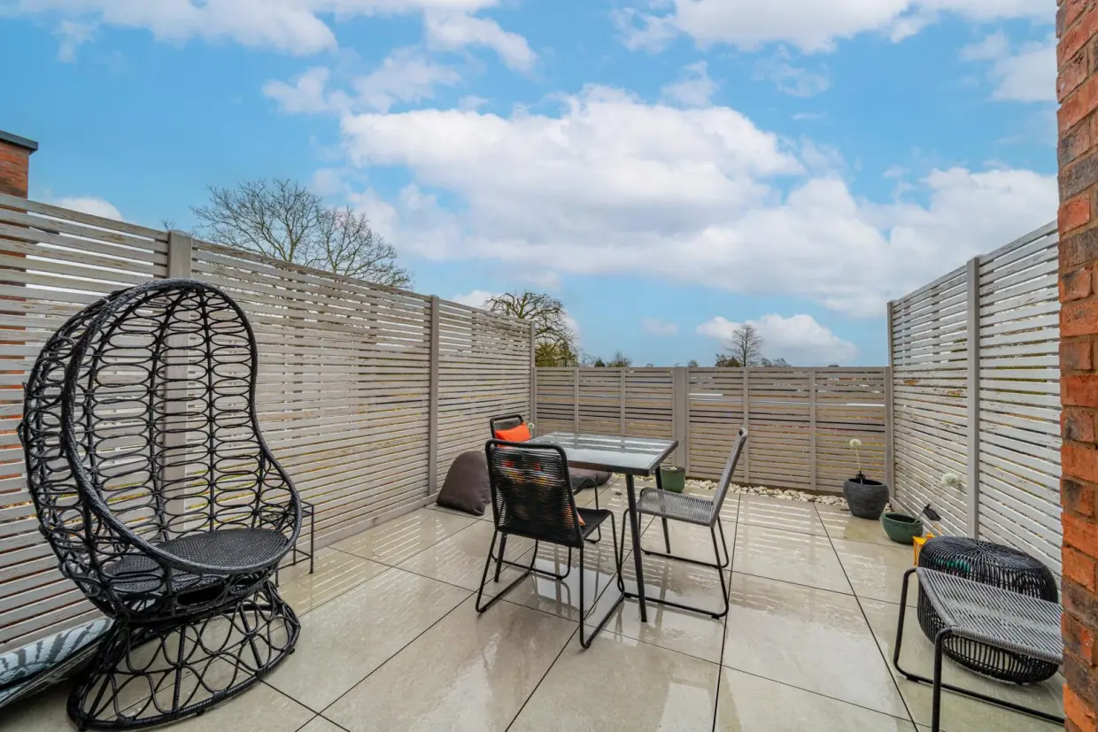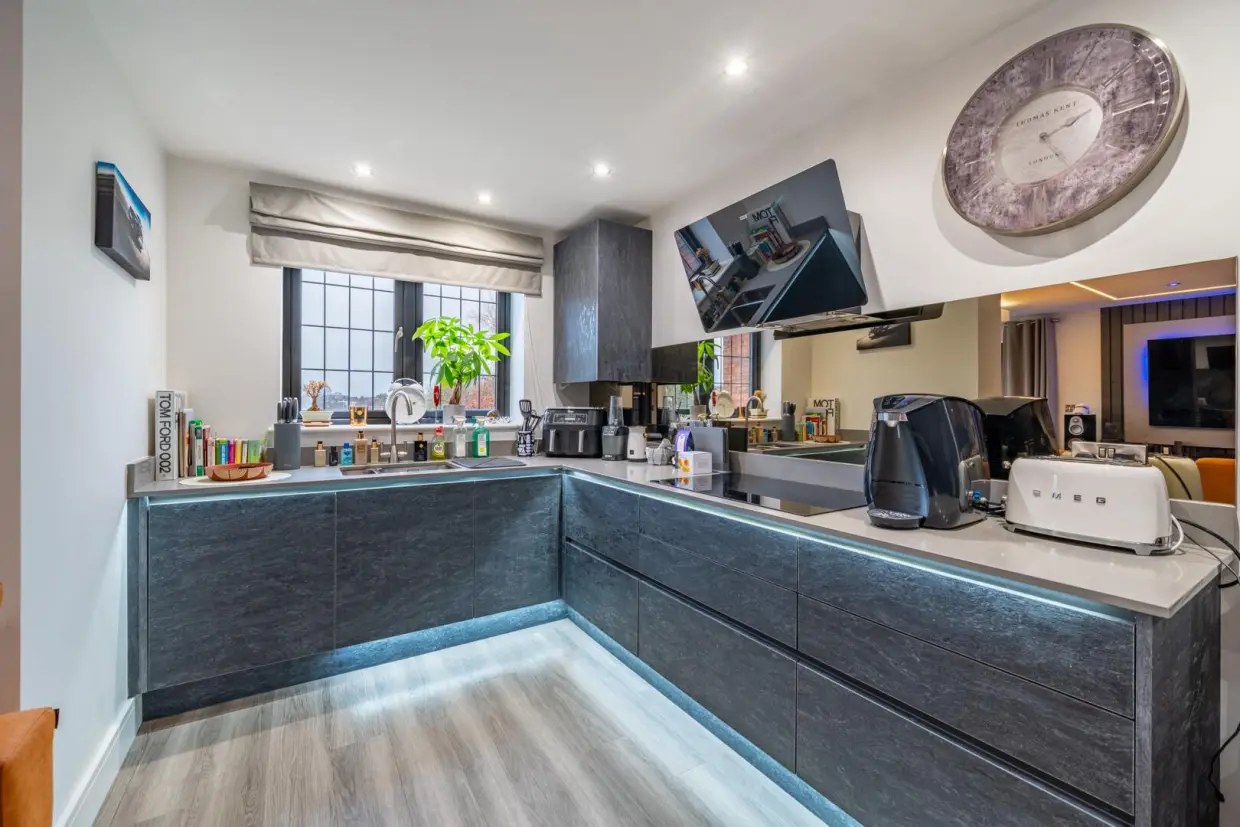 Set within an exclusive gated development on the sought-after Nicker Hill, this beautifully proportioned two-bedroom apartment offers contemporary living in a peaceful yet well-connected location.The apartment is thoughtfully laid out to maximise space and natural light. At the heart of the home is a generous open-plan living, kitchen and dining area, ideal for both everyday living and entertaining. The living space is enhanced by a stylish built-in media wall, creating a sleek focal point and a perfect setting for relaxing evenings. The kitchen area is well arranged with ample worktop and storage space, seamlessly flowing into the dining and lounge areas. Double doors lead out to a private balcony, providing a lovely outdoor retreat.