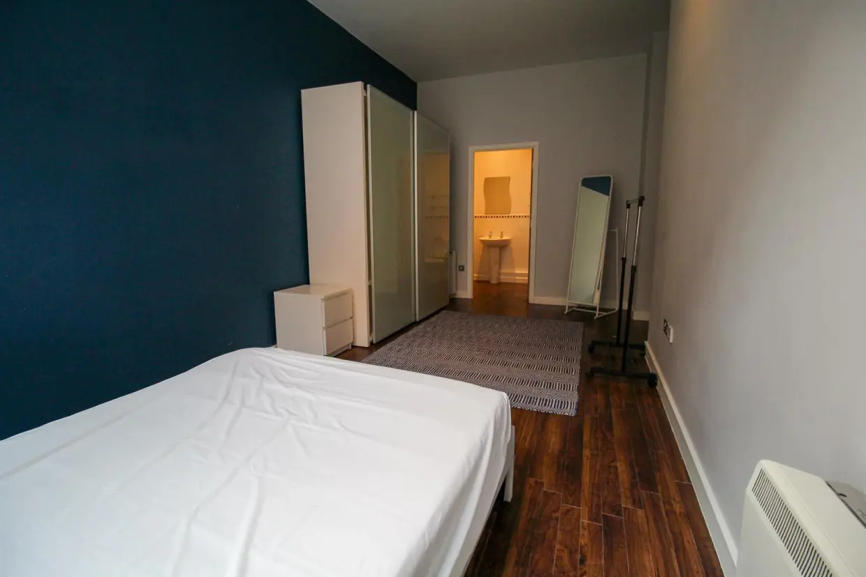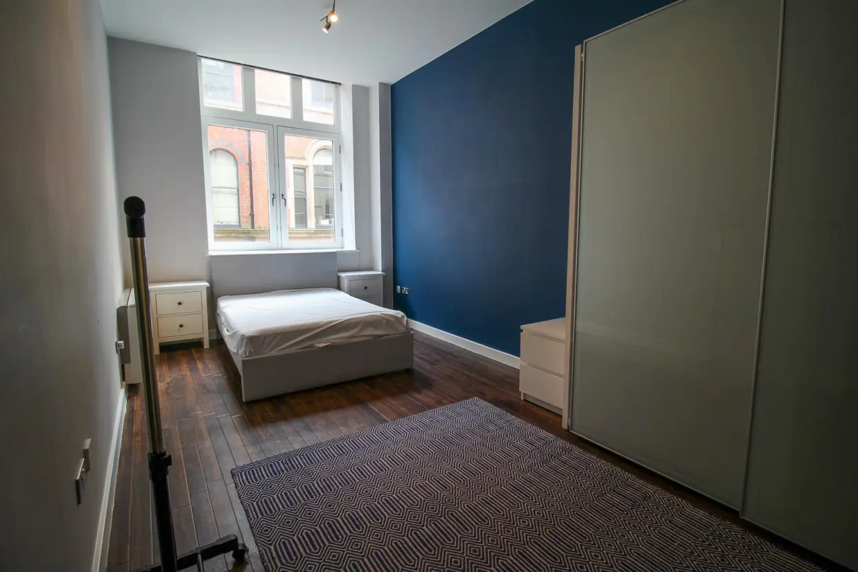 MASTER BEDROOM – A spacious and naturally bright double bedroom with white-washed walls as well as a large navy blue feature wall, wood-effect vinyl flooring, and a window overlooking Plumptre Street. This room also benefits from a well-appointed en-suite shower room.