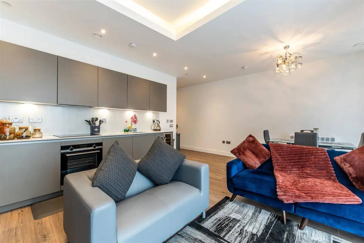 NO UPWARD CHAIN! A stunning modern one-bedroom apartment, within easy reach of West Bridgford town centre and Nottingham city centre. The apartment offers an ideal first time buy, downsize or investment. It is located in a secure gated development with a concierge and reception area.You enter the development via the concierge entrance with secure gated access to the lobby area, with lifts and stairs that take you to the landing and front entrance door. On entering the property you are greeted by the reception hallway with LVT flooring and doors leading to the bedroom, bathroom and open plan kitchen living area. The kitchen has a range of modern wall and base units, Quartz worktop and integrated appliances, including a fridge freezer, oven, induction hob and wine cooler. The kitchen opens out the living dining space, a great space for entertaining.