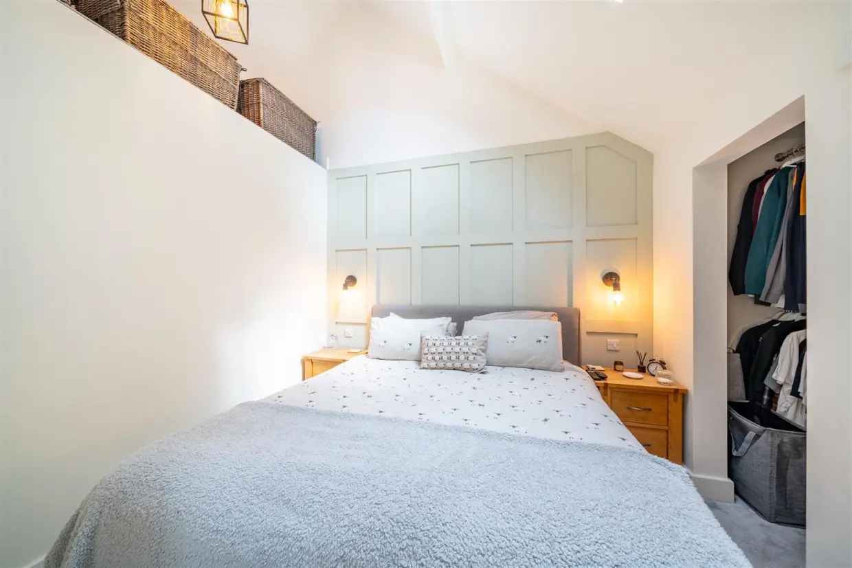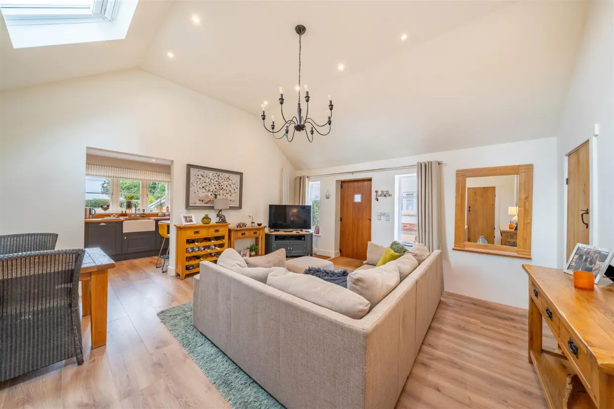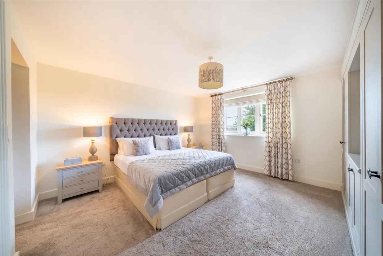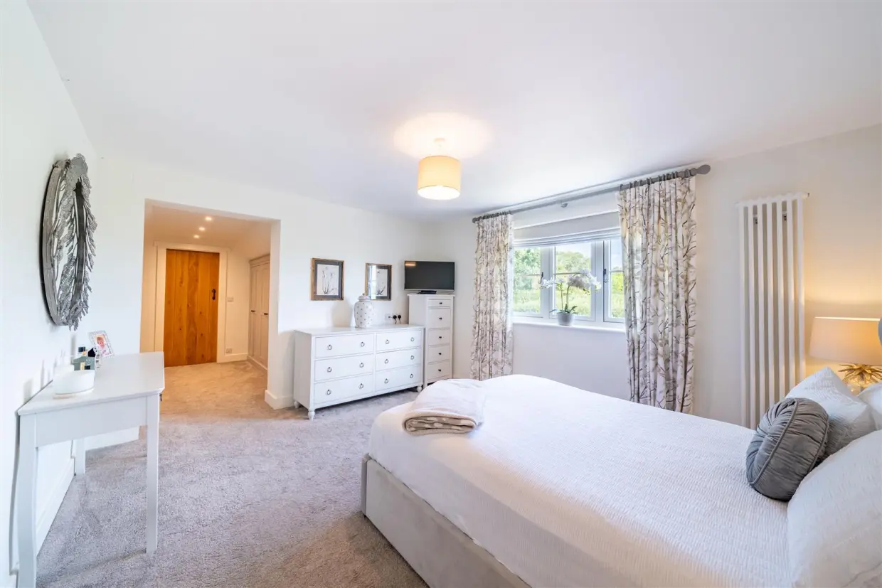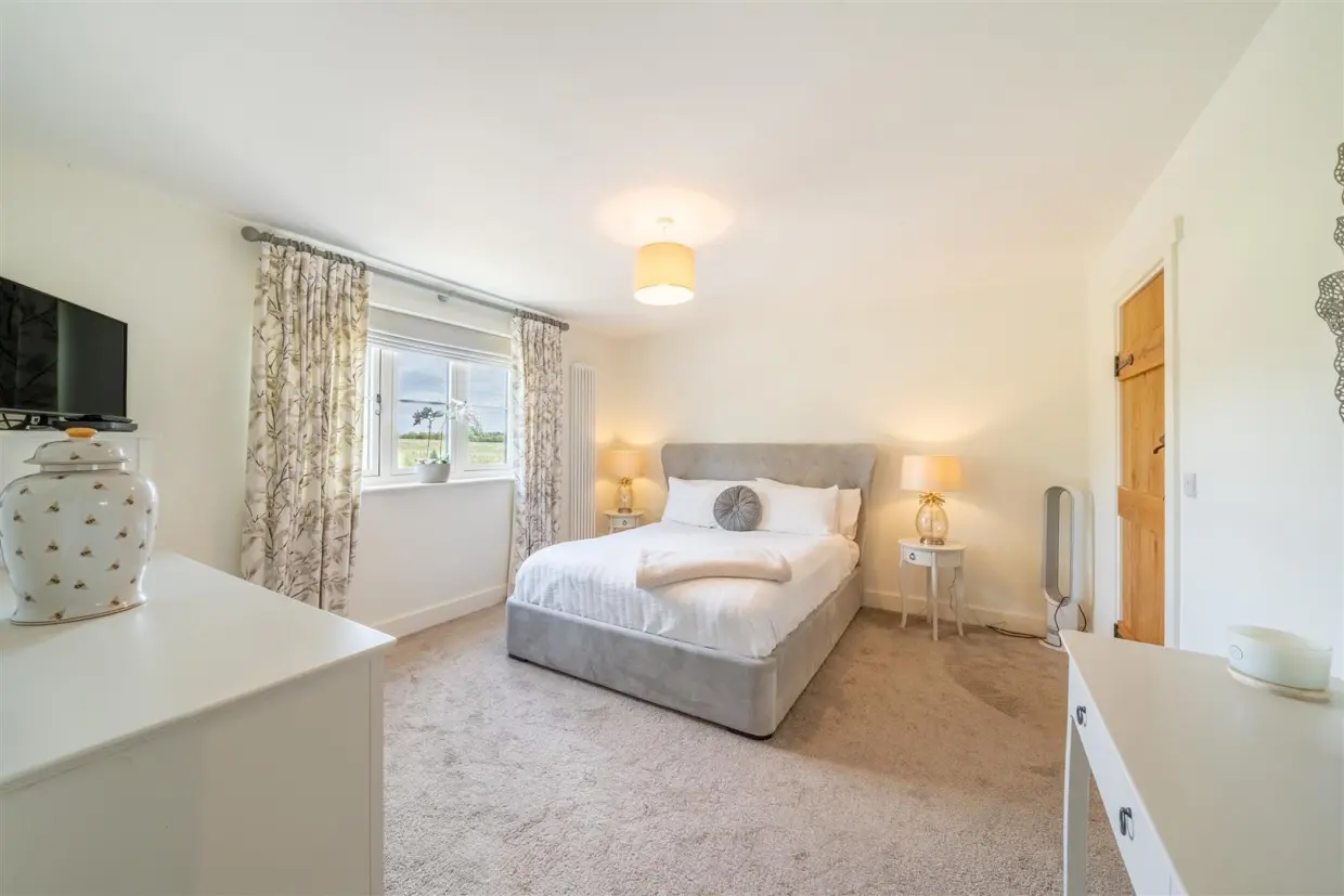 The detached two-bedroom bungalow annex is finished to the same impeccable standards as the main house. Vaulted ceilings and Velux windows allow light to pour into the main living space, which is further enhanced by wood laminate flooring and oak latch doors leading to the bedrooms. The fully fitted kitchen, with a Belfast sink, offers lovely views over the garden and comes with integrated appliances. The main bedroom benefits from an en-suite WC and a walk-in wardrobe, while a door from the living area leads to a stylish three-piece en-suite shower room.