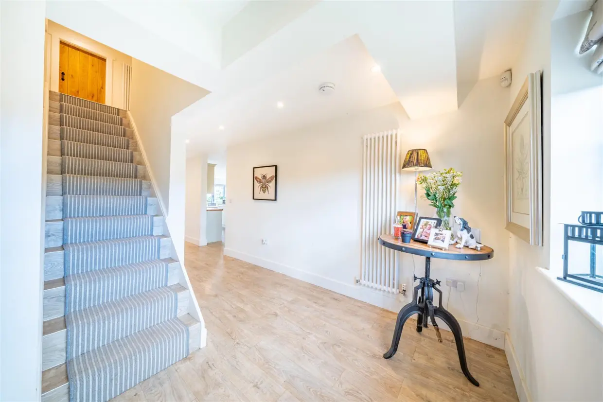 Upon entering, you are greeted by a bright and airy hallway, featuring wood-effect LVT flooring, contemporary radiators, and a window to the front. The hallway grants access to a well-proportioned office with a side-facing window, a staircase ascends to the first floor from the hallway that seamlessly flows into the breathtaking open-plan ground floor living space, designed to perfection. The wood-effect flooring continues throughout, complementing a bespoke range of handcrafted wall and base units, a central island with a Belfast sink, and stone worktops. The adjoining kitchen pantry offers space for fridge freezers, while the expansive dining and seating area, with three sets of bifold doors, to the rear and a further to the side, providing stunning views of the garden and rolling countryside beyond. A roof lantern allows natural light to flood the space, creating a warm and inviting atmosphere. An open plan doorway leads to a cosy snug/family room with a front-facing window. A further double doorway opens into the main lounge, where the impressive Ingle nook fireplace with featuring a brick inset, wood mantle, and cast-iron log burner, creates a striking focal point. The living space extends further with access to a side hallway leading to the garden. The property also benefits from a utility room with plumbing for a washer and dryer, a further storage/utility room, and a beautifully appointed downstairs WC.