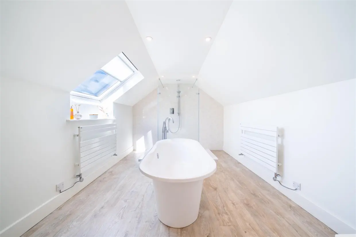 The first floor boasts a generous landing, providing access to four well-appointed bedrooms. The master suite offers views to the front and leads into a walk-in wardrobe area connecting to a luxurious four-piece bathroom, complete with a central roll-top bath and a window overlooking the rear. The second bedroom features its own en-suite four-piece bathroom, finished to the same high standards with views as dose bedrooms three which shares a stylish Jack-and-Jill en-suite shower room with bedroom four and both include built-in wardrobes.
