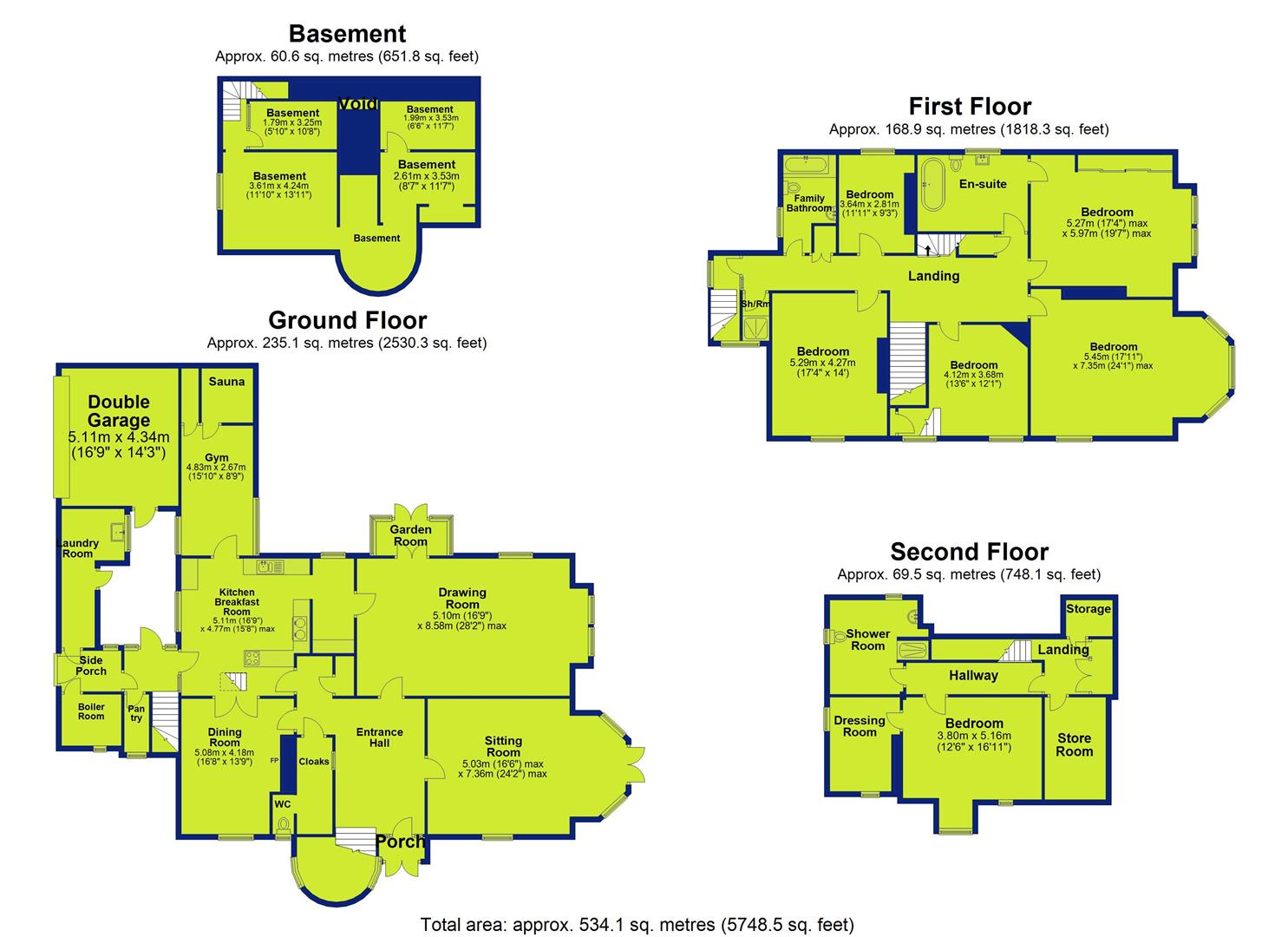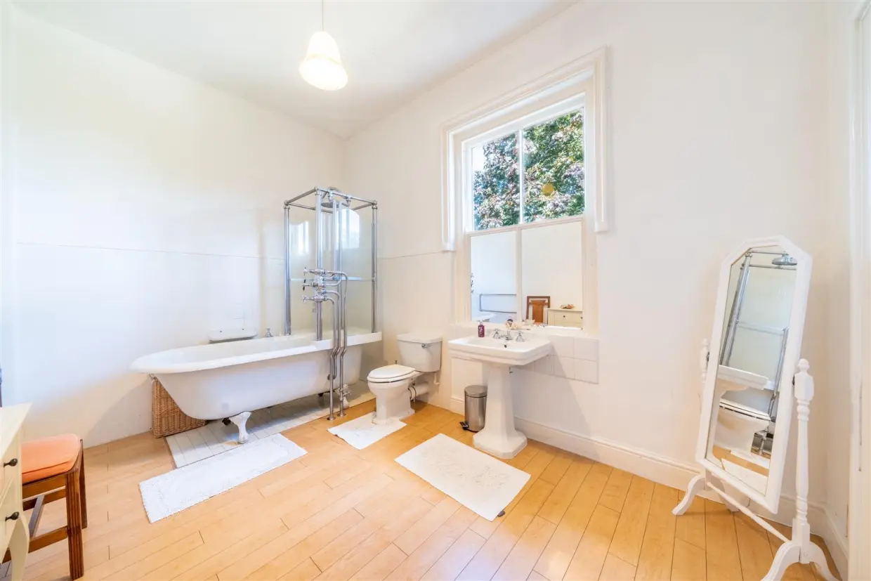 The first floor hosts five generously proportioned bedrooms, each enhanced by tall period windows that flood the interiors with natural light. The principal suite is complemented by an en-suite bathroom featuring a classic roll-top bath, while an additional family bathroom serves the remaining rooms in keeping with the home's timeless elegance. The second floor provides further flexibility with a bedroom, shower room, dressing room and storage, perfectly suited to guest accommodation, a teenager's retreat, or a dedicated home office.