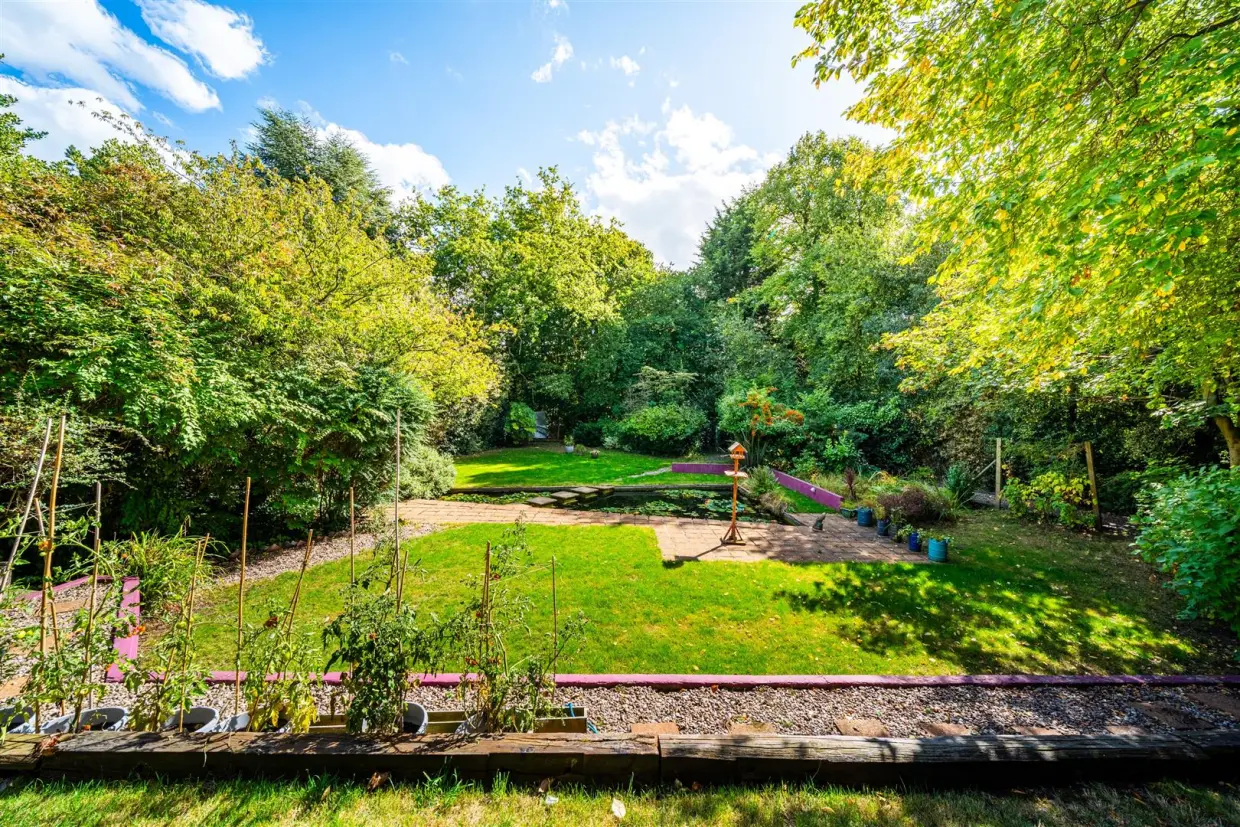 The landscaped gardens create a private and picturesque sanctuary. A broad terrace provides the ideal setting for outdoor dining and entertaining, while sweeping lawns, established trees, well-stocked borders, and an ornamental pond contribute to a tranquil and beautifully maintained retreat.