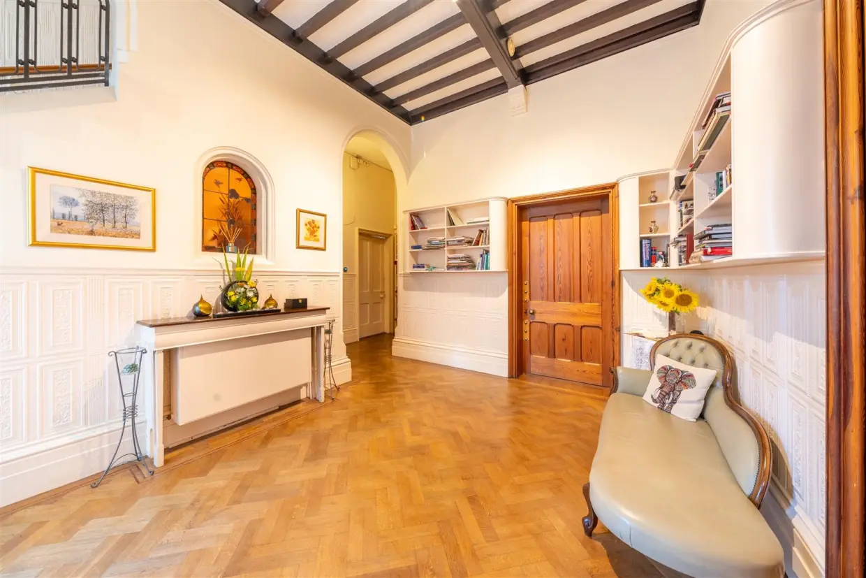 An impressive detached Victorian residence over 5,700 sq. ft., including the cellars and garage. This distinguished home occupies a prominent position on one of The Park's most sought-after roads. Surrounded by a collection of equally elegant period properties, it forms part of a visually striking streetscape that blends historic charm with prestige. Set behind a gated entrance, the property enjoys both privacy and presence, with its scale and architectural character immediately apparent. Ideally situated to offer the best of both worlds, it combines the tranquillity of a leafy residential setting with effortless access to Nottingham's vibrant city centre, where an array of shops, boutiques, cafés, bars, restaurants, and cultural landmarks such as Nottingham Castle are all within easy reach. Excellent transport links ensure convenient connections to surrounding areas while maintaining the peaceful atmosphere of The Park.A striking arched stained-glass door with matching side panels opens into a grand reception hall, where parquet flooring, decorative wall panelling, and a remarkable marble-pillared staircase establish a sense of grace and grandeur. The ground floor offers a sequence of elegant and versatile rooms, including a drawing room with dual-aspect windows, high ceilings and fine wooden flooring, a light-filled sitting room with deep bay window and French doors opening to the garden, a charming morning room ideal for entertaining, and a well-proportioned dining kitchen that seamlessly integrates with family living. Completing this level are additional practical facilities, including a side porch with pantry, a separate laundry, and a private mini gym with sauna.
