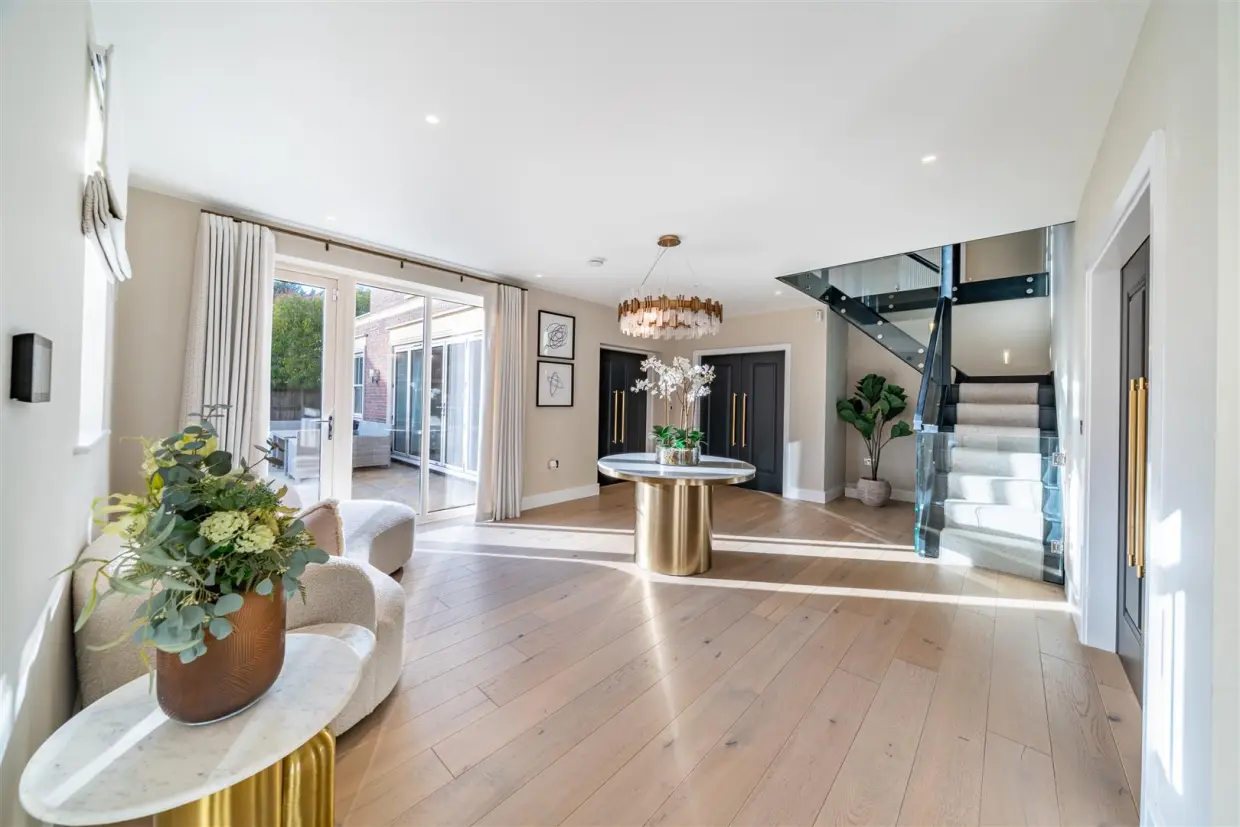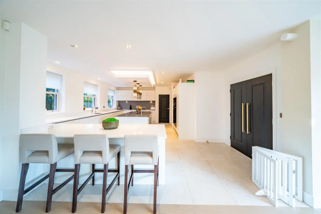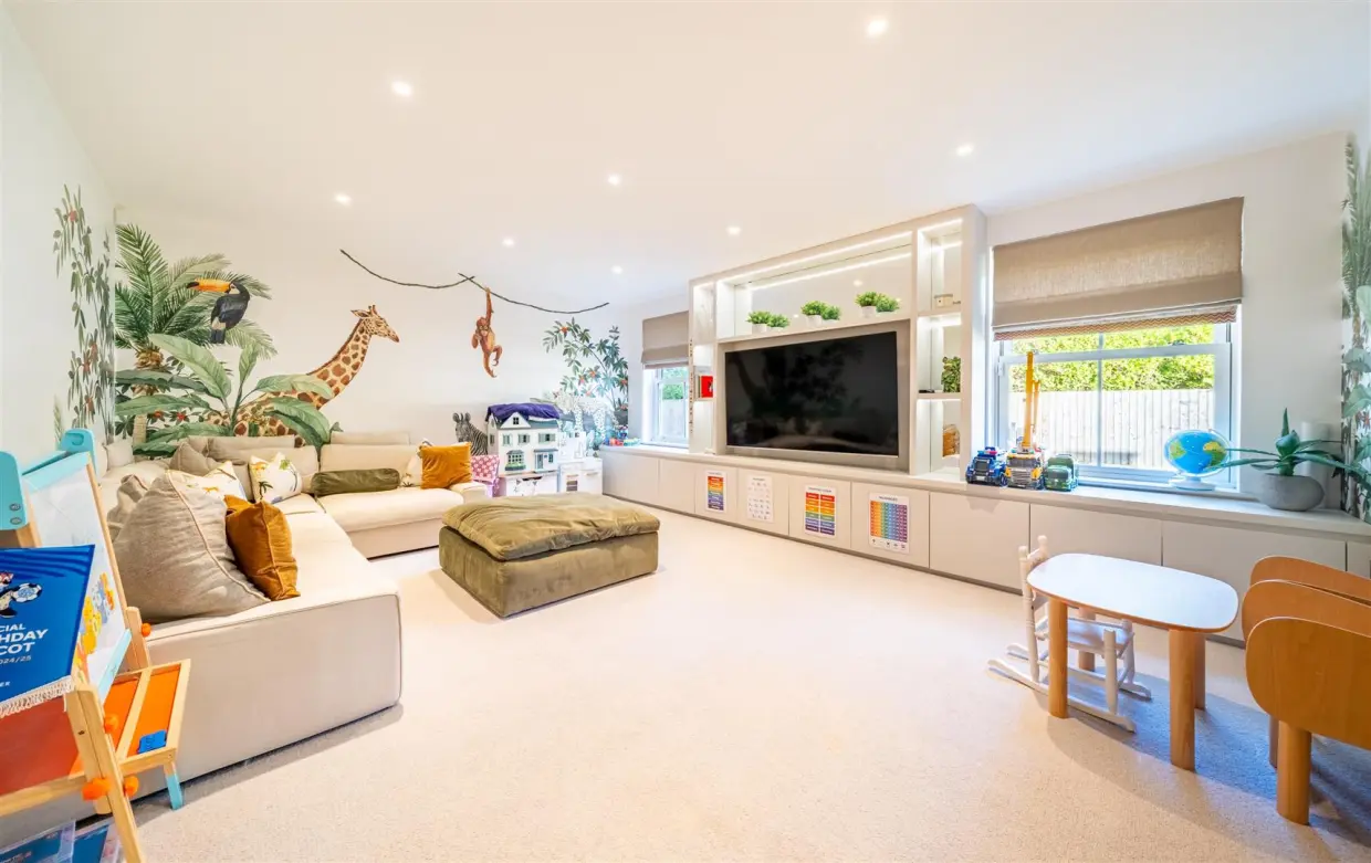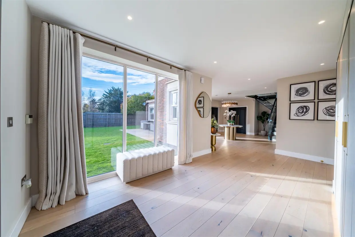 At the heart of the property is an impressive open-plan living kitchen, perfectly suited to everyday family living as well as large-scale entertaining. Full-height sliding doors open directly onto the rear terrace and gardens, creating a seamless connection between the indoor and outdoor spaces. The ground floor also includes a formal living room, a versatile playroom or cinema room, a study, and a well-appointed utility and boot room, providing excellent functionality for modern family life.