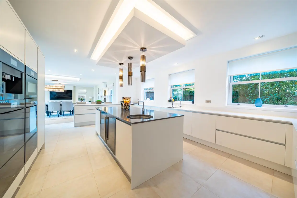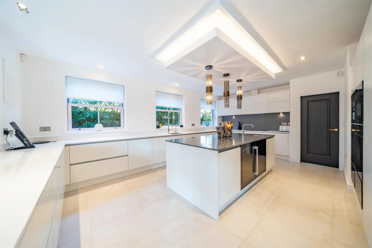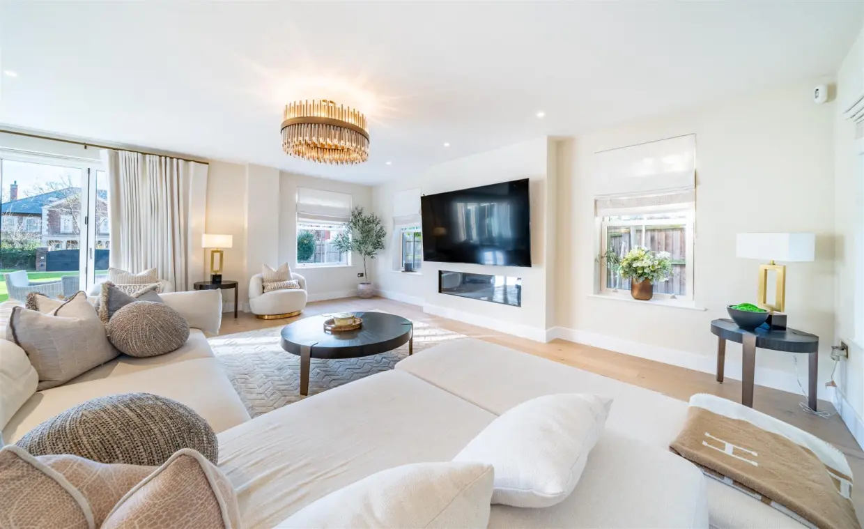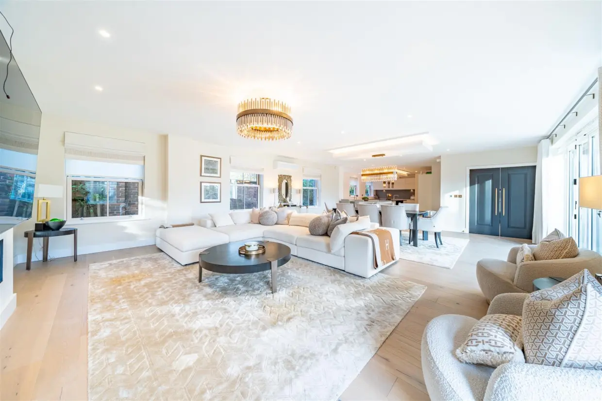 At the heart of the property is an impressive open-plan living kitchen, perfectly suited to everyday family living as well as large-scale entertaining. Full-height sliding doors open directly onto the rear terrace and gardens, creating a seamless connection between the indoor and outdoor spaces. The ground floor also includes a formal living room, a versatile playroom or cinema room, a study, and a well-appointed utility and boot room, providing excellent functionality for modern family life.