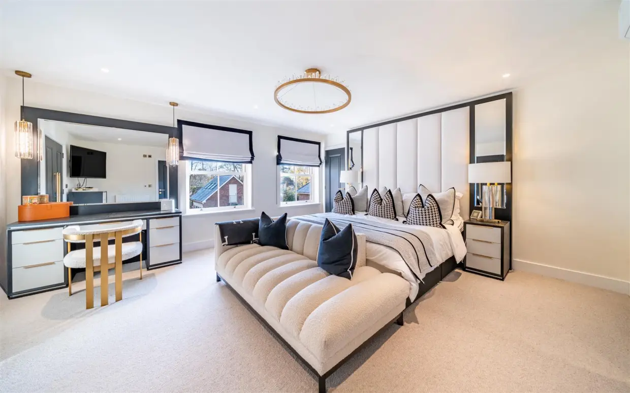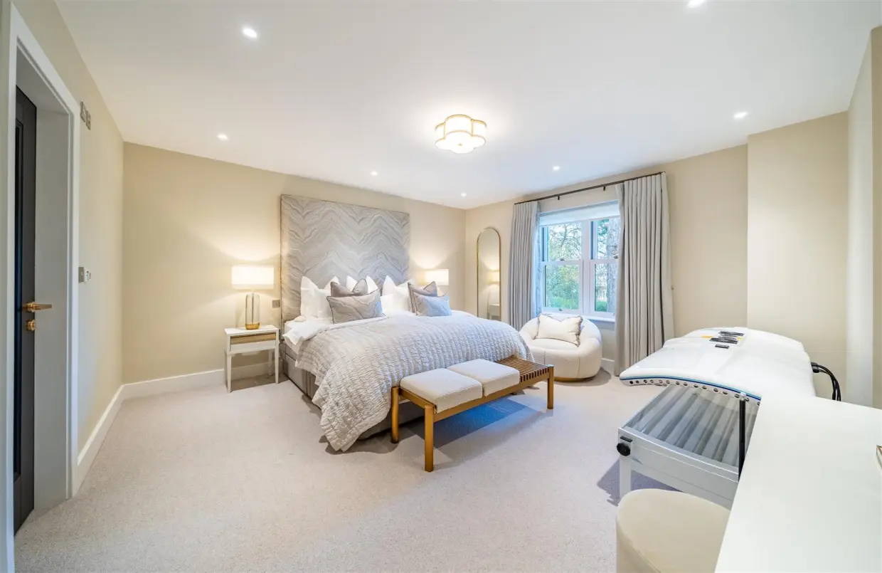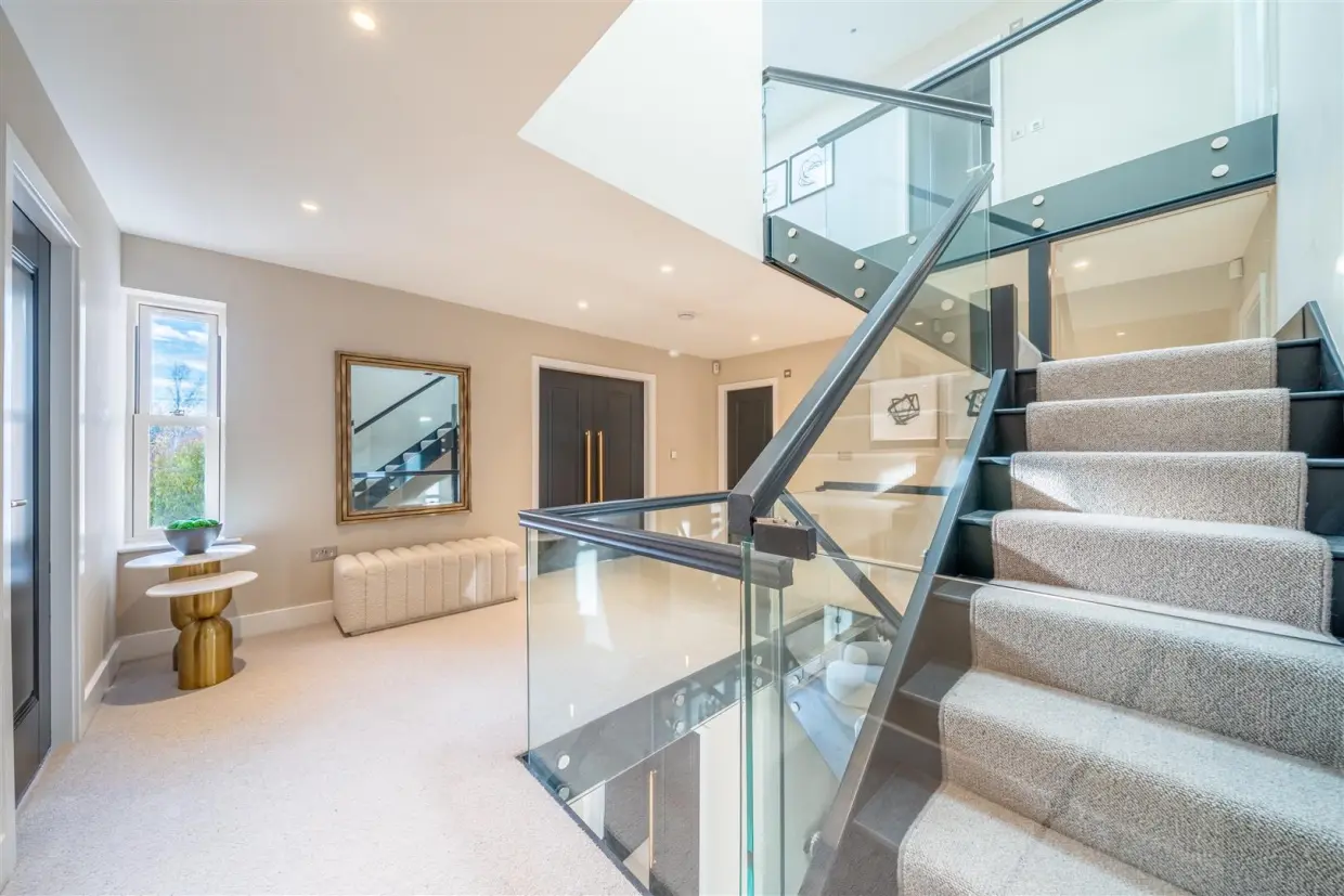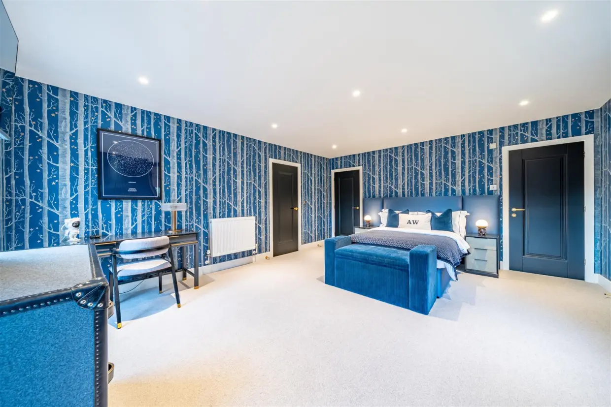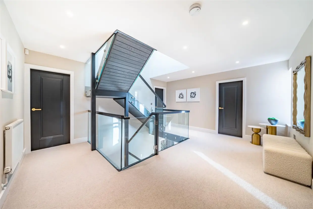 The first floor features a beautifully arranged collection of bedroom suites, including a luxurious master suite complete with a bespoke dressing area and an elegant en-suite bathroom. The remaining bedrooms are equally generous in size and are complemented by high-specification bathrooms featuring contemporary tiling, walk-in showers, and premium fixtures.