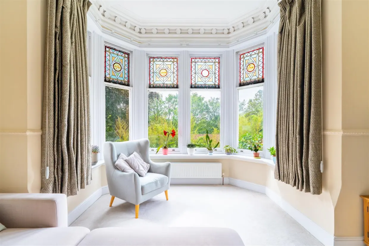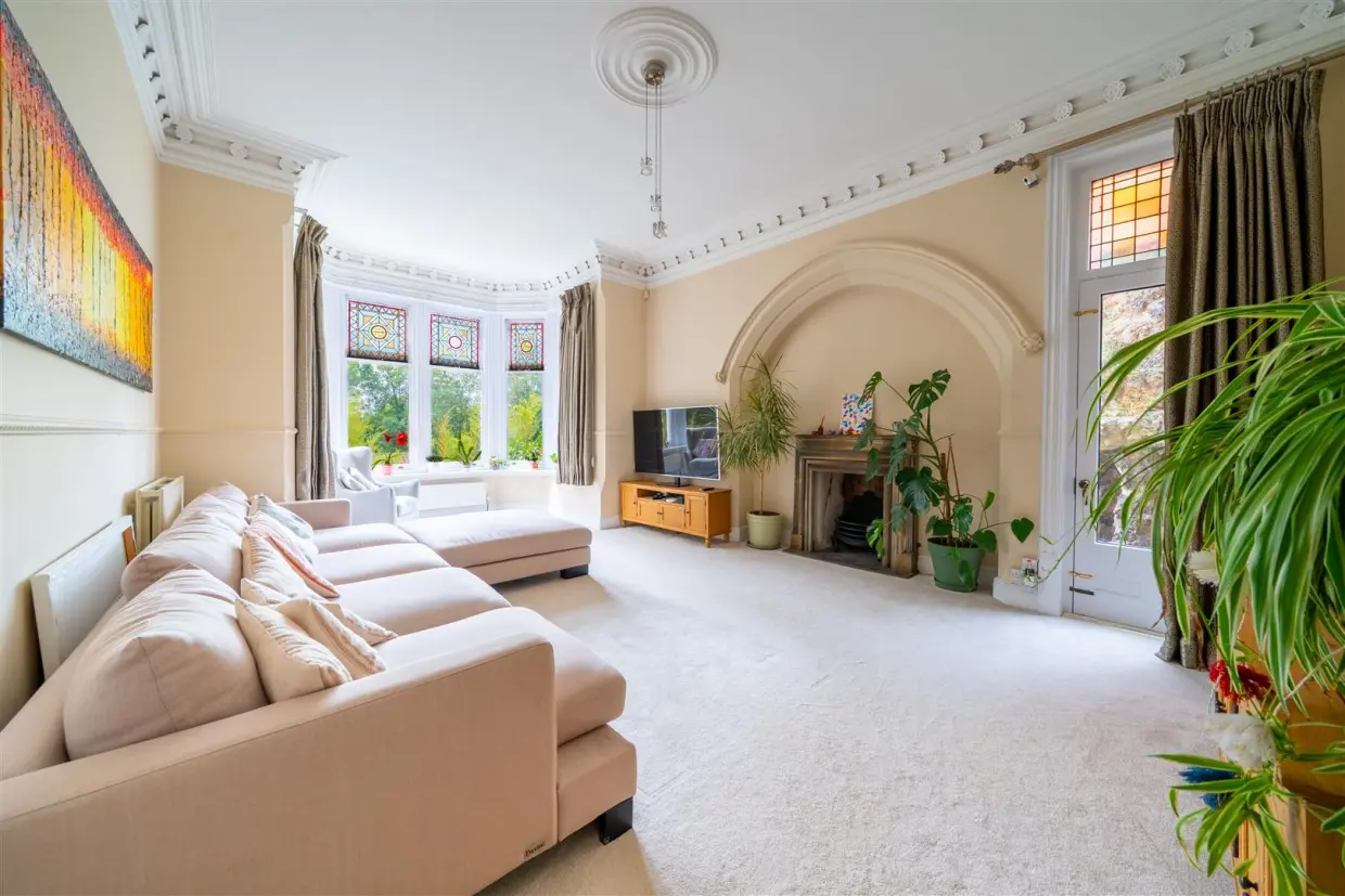 - Spacious sitting room with dual-aspect windows, period cornicing, and high ceilings