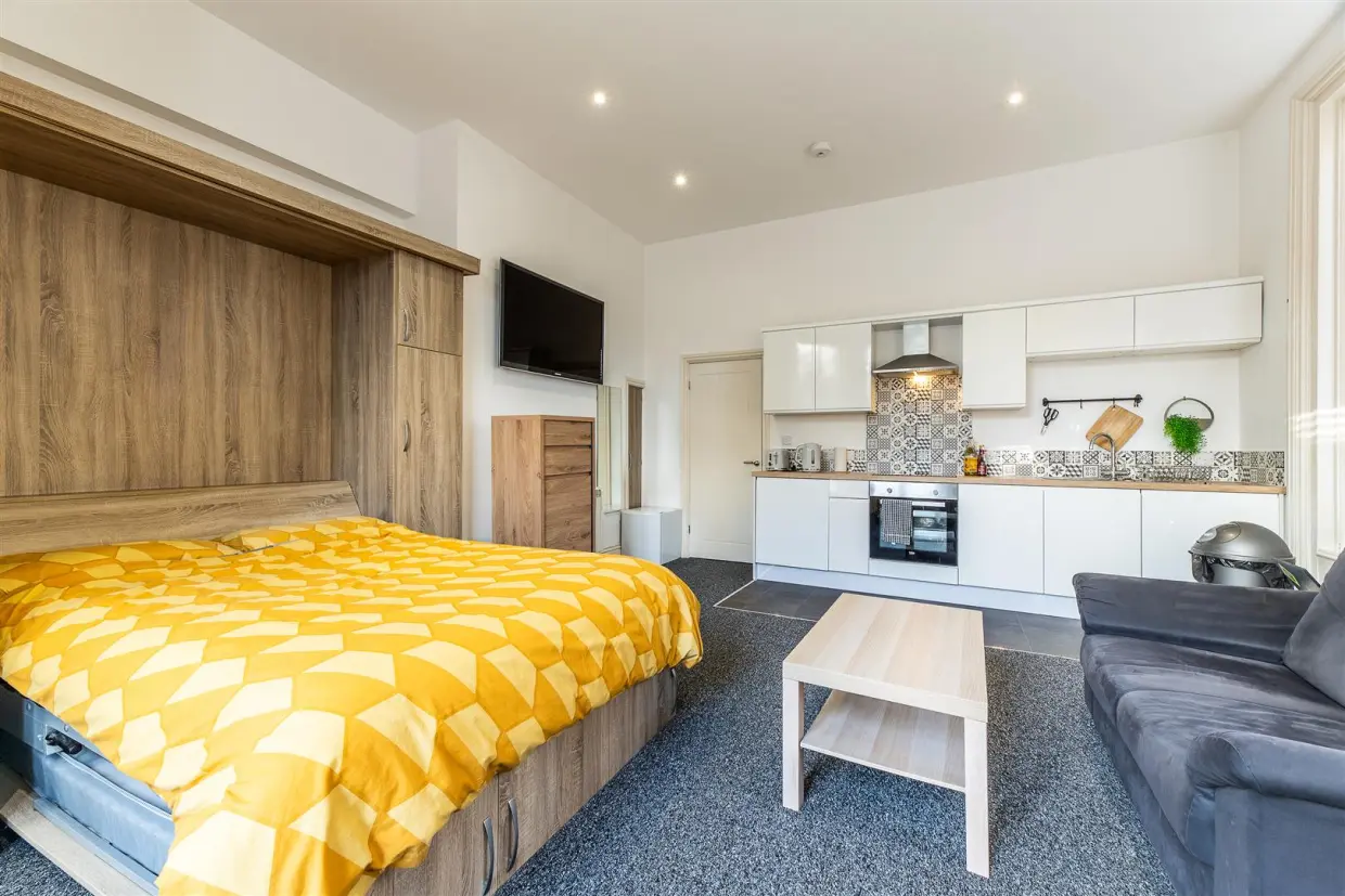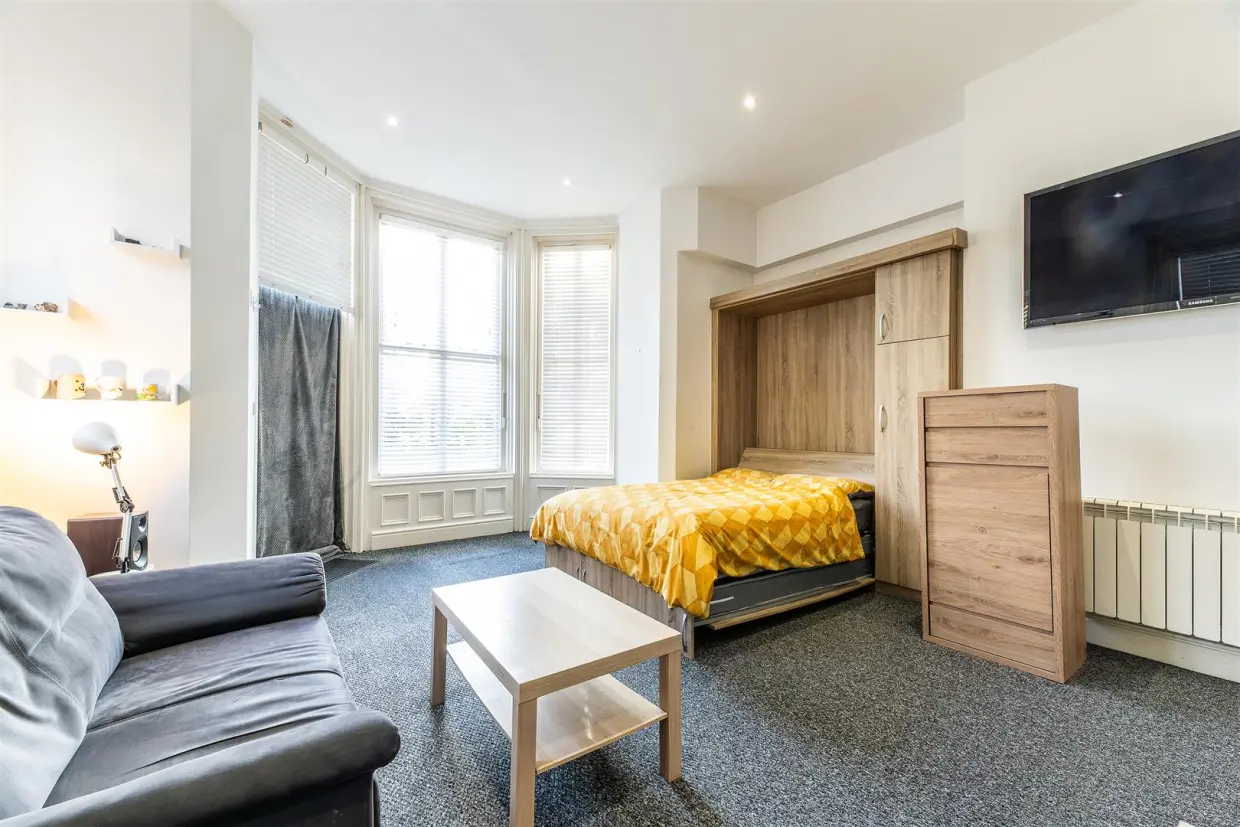 This attractive property offers a rare opportunity to acquire a well-presented studio apartment, benefitting from access to a delightful patio area and well-maintained communal gardens.The accommodation briefly comprises an open-plan living, sleeping and kitchen area, thoughtfully designed to maximise space and functionality. The kitchen is fitted with modern units and integrated appliances, while the living space features an elegant pull-down bed unit. A high ceiling and a large bay window, incorporating a French-style door, flood the room with natural light and enhance the sense of space. In addition, there is a contemporary shower room fitted with a modern suite. Early viewing is highly recommended.