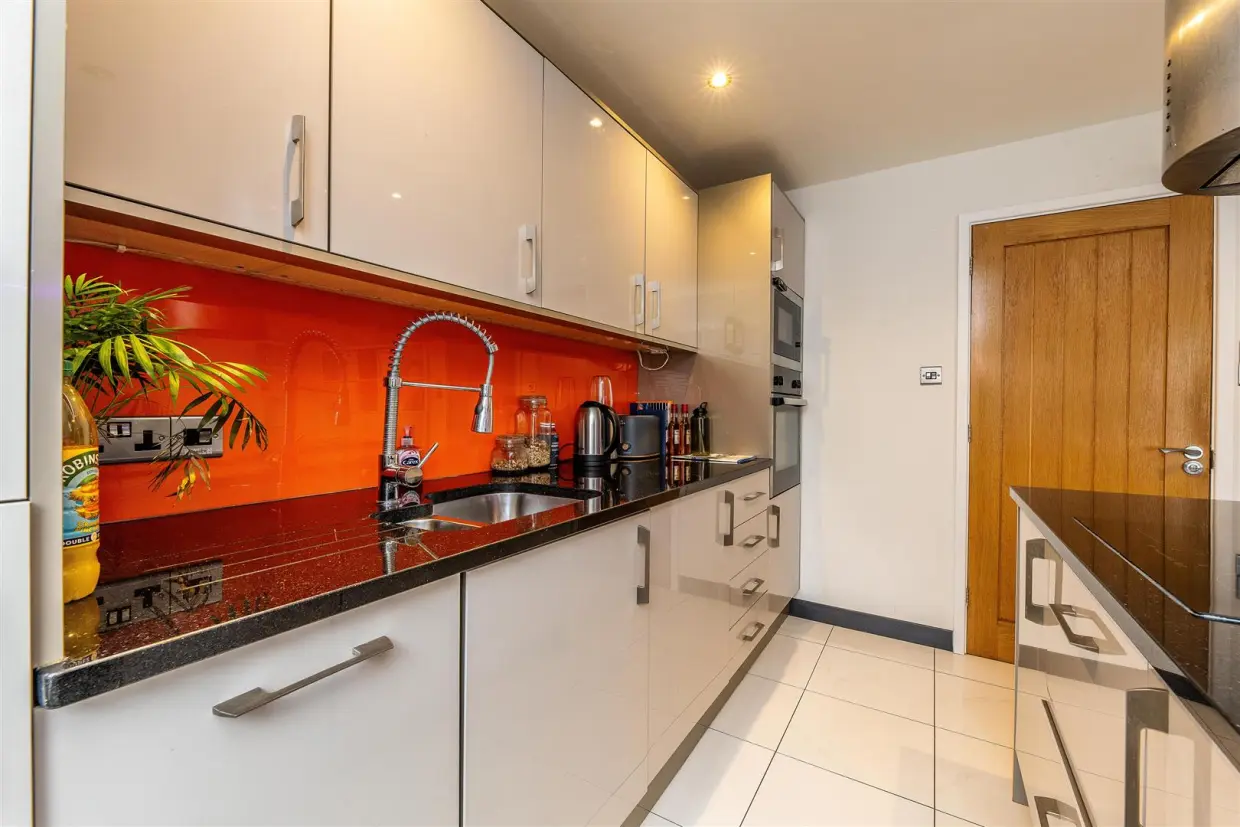 This space is awash with natural light, courtesy of a large square bay window and an additional window in the kitchen. The modern kitchen boasts high-gloss wall and base units, a stylish kitchen island, and integrated appliances, ensuring both function and sophistication.