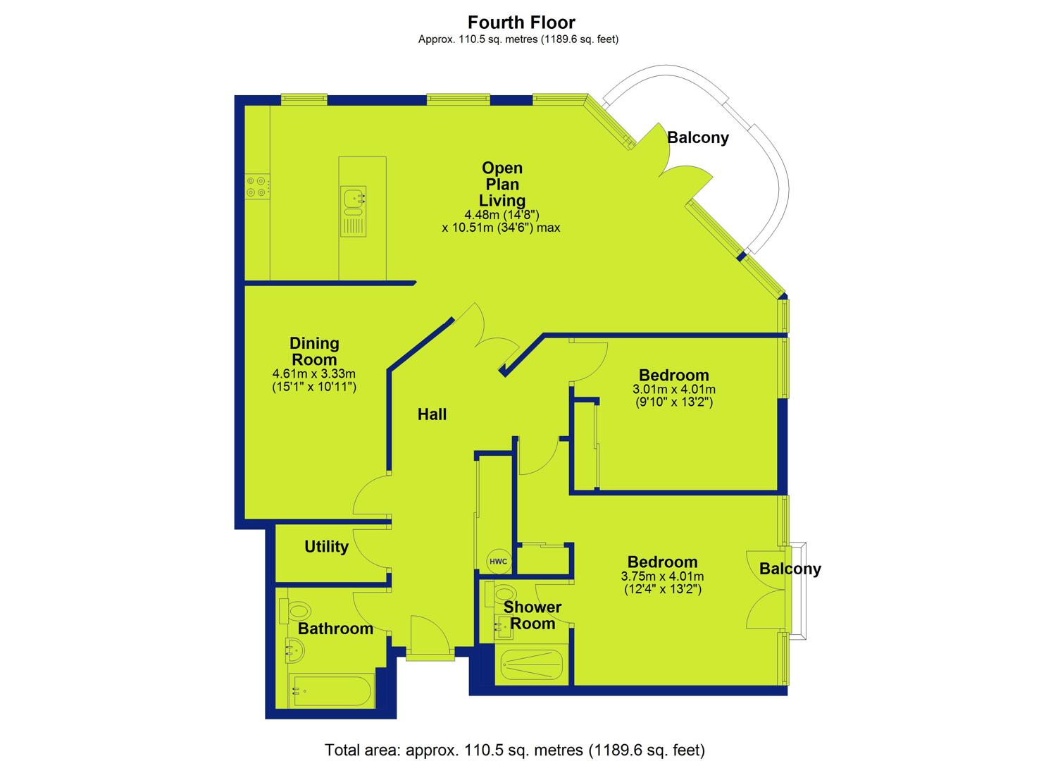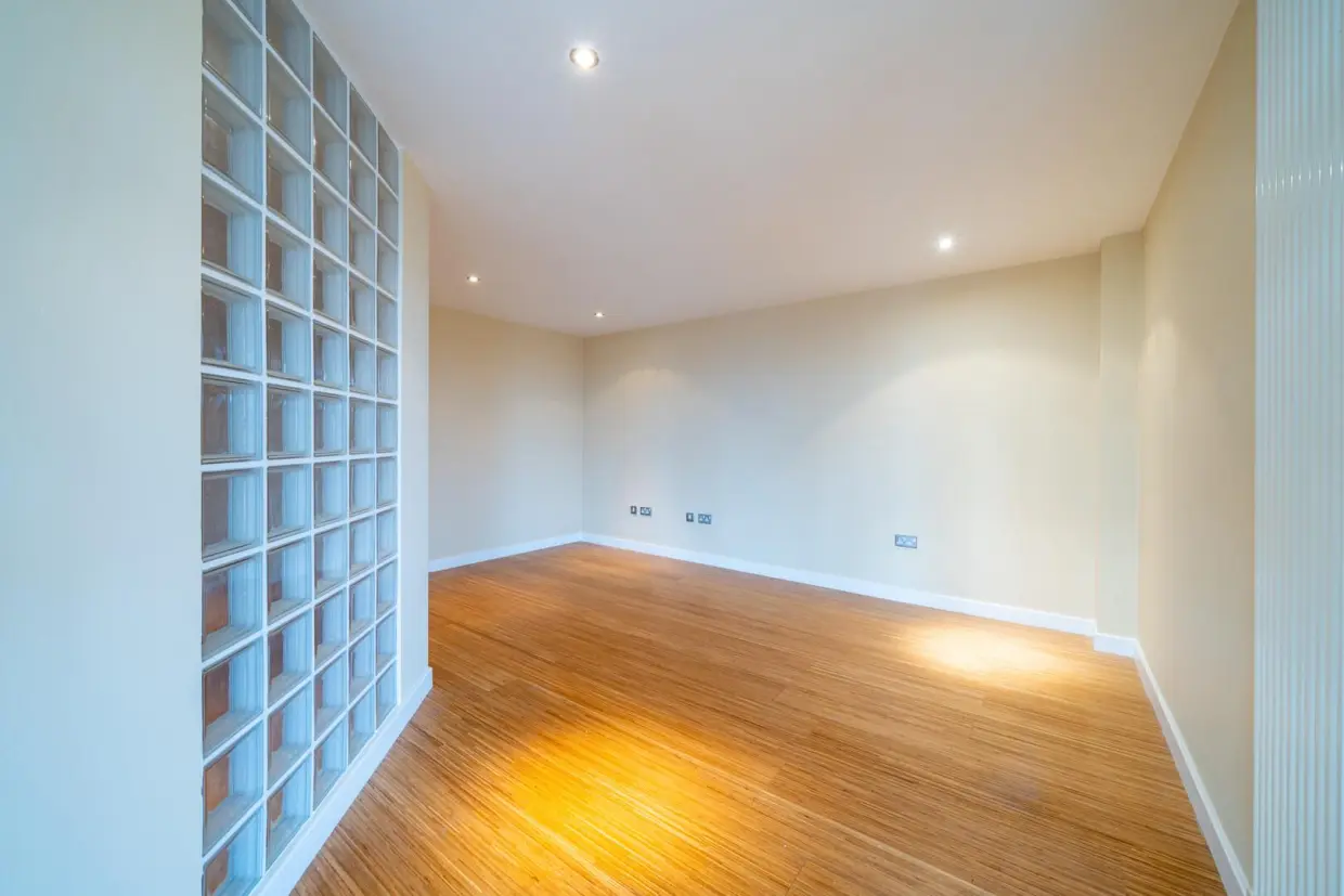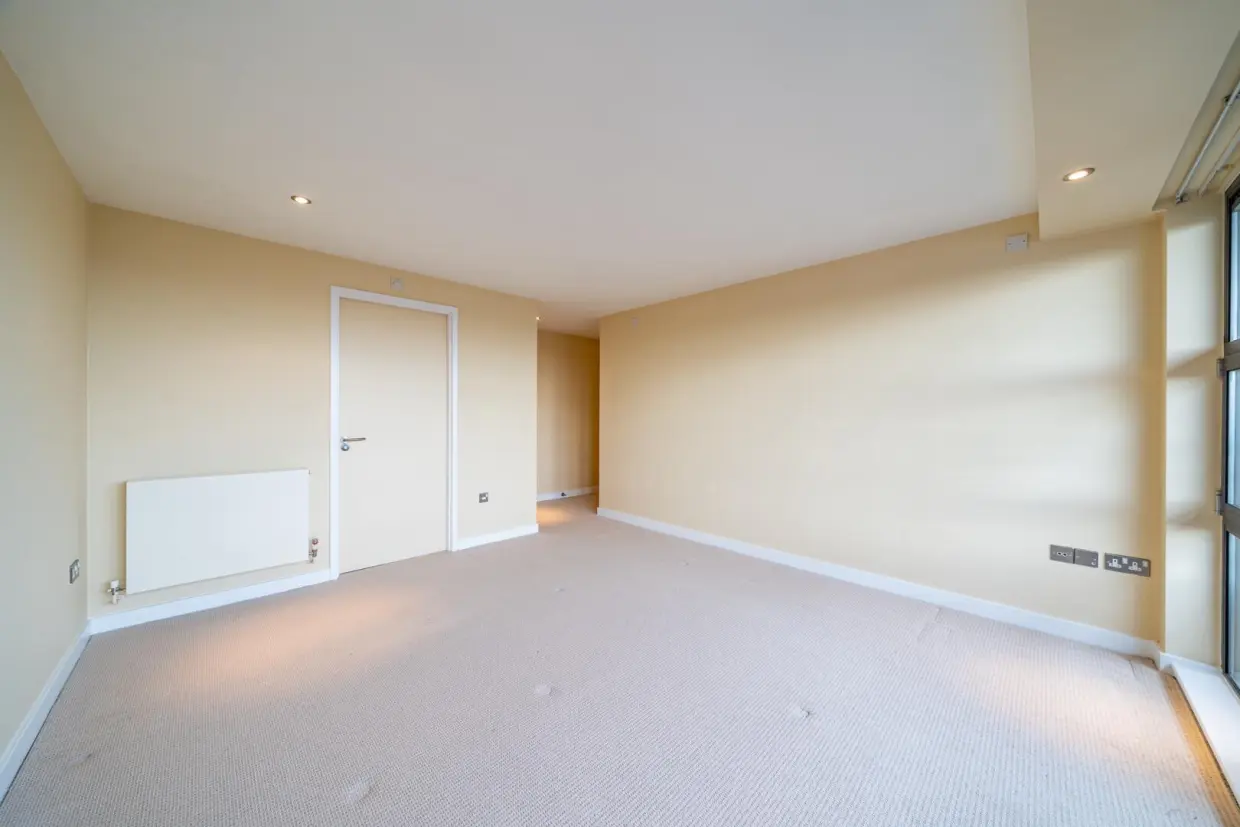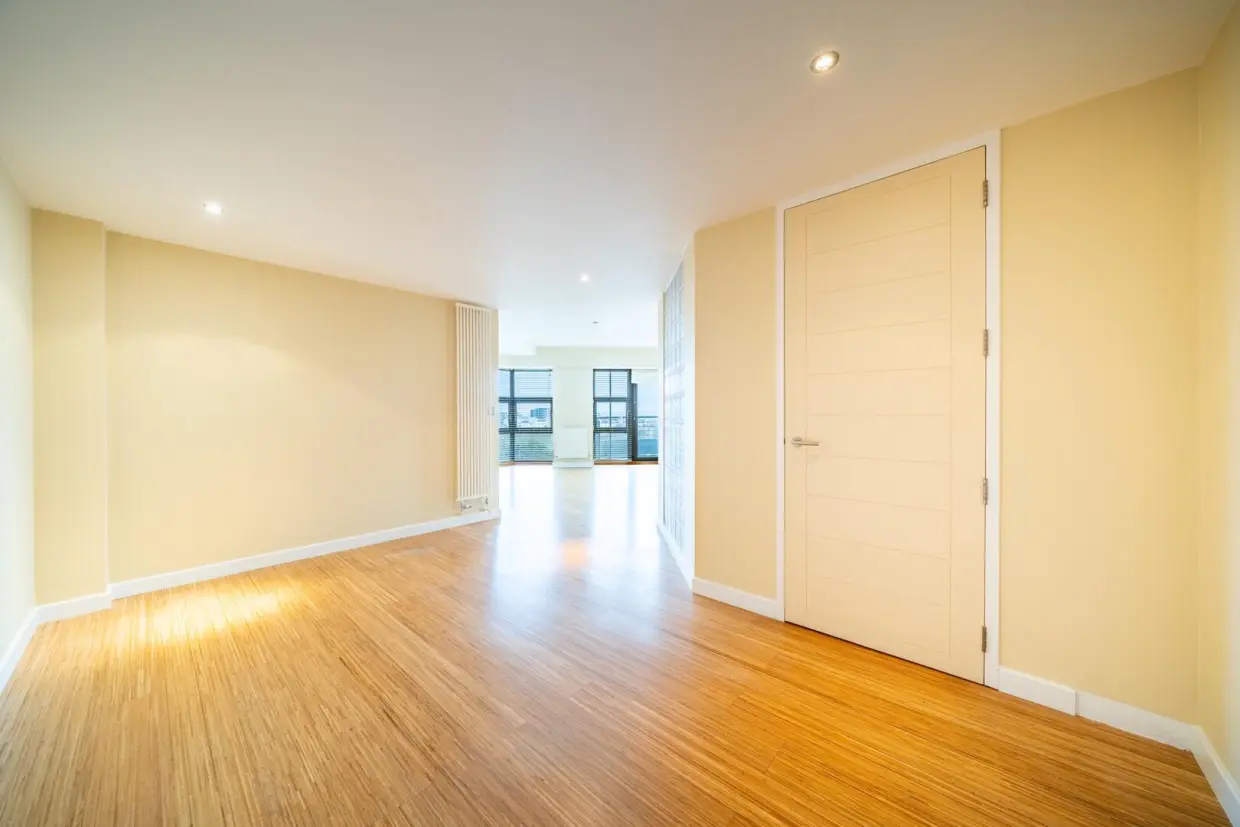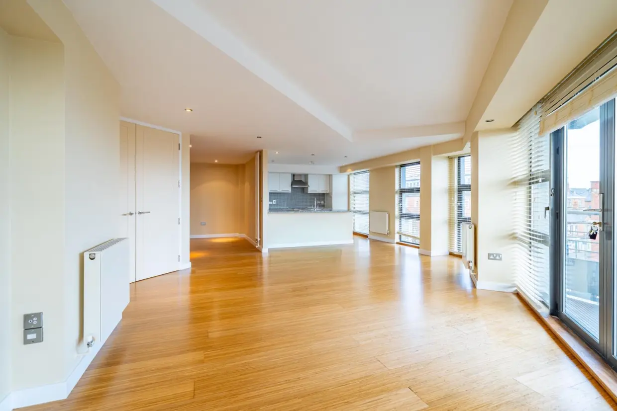 Extending to over 1,200 sq ft, the private entrance hall leads through double doors into an impressive open-plan living, dining and kitchen space. The kitchen is fitted with a range of modern units, granite work surfaces and integrated appliances, while engineered flooring runs throughout the living area and hallway, complementing the contemporary design and providing direct access to the balcony.