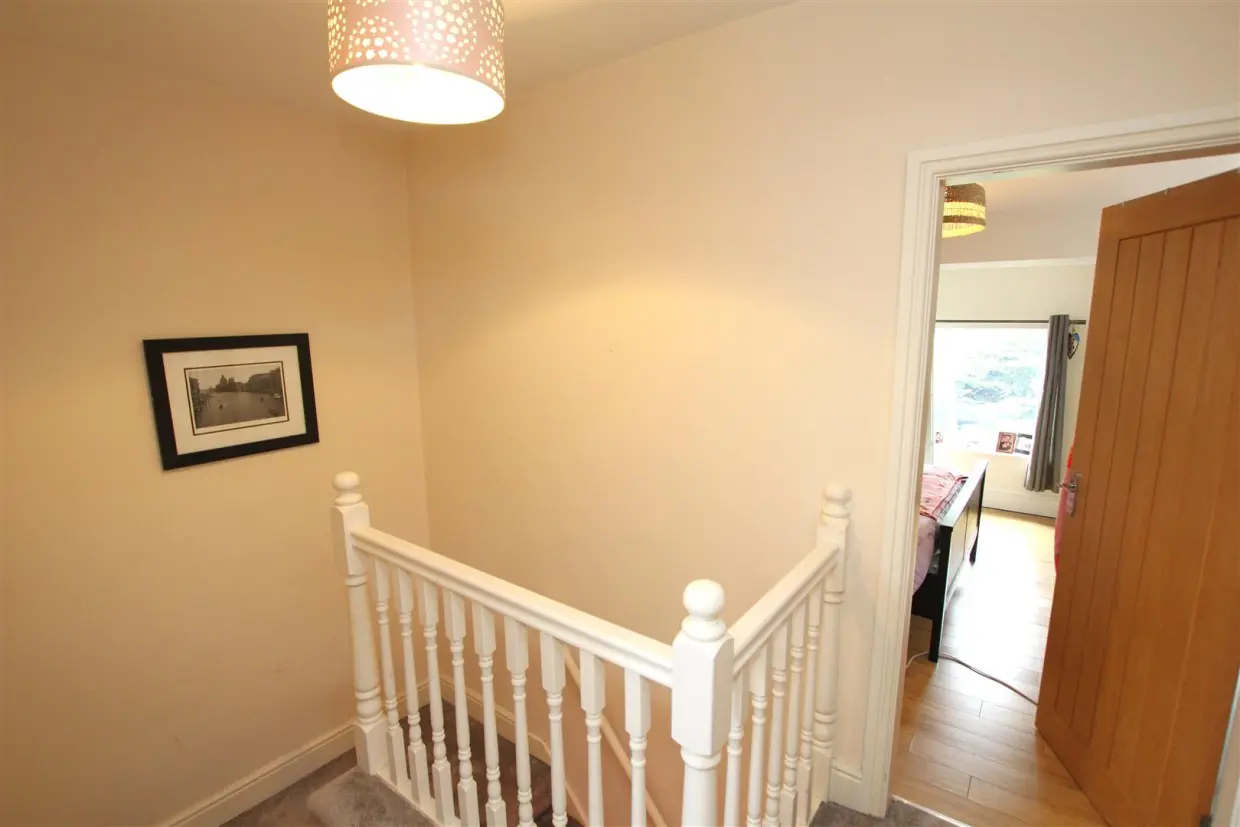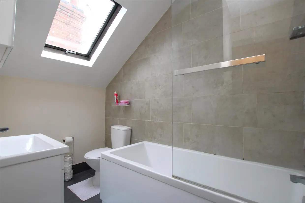 Upstairs, the first-floor landing leads to two well-proportioned bedrooms and a modern three-piece bathroom suite, all beautifully finished. The bathroom features a Velux roof window, adding a touch of natural illumination.