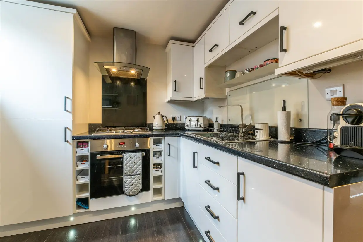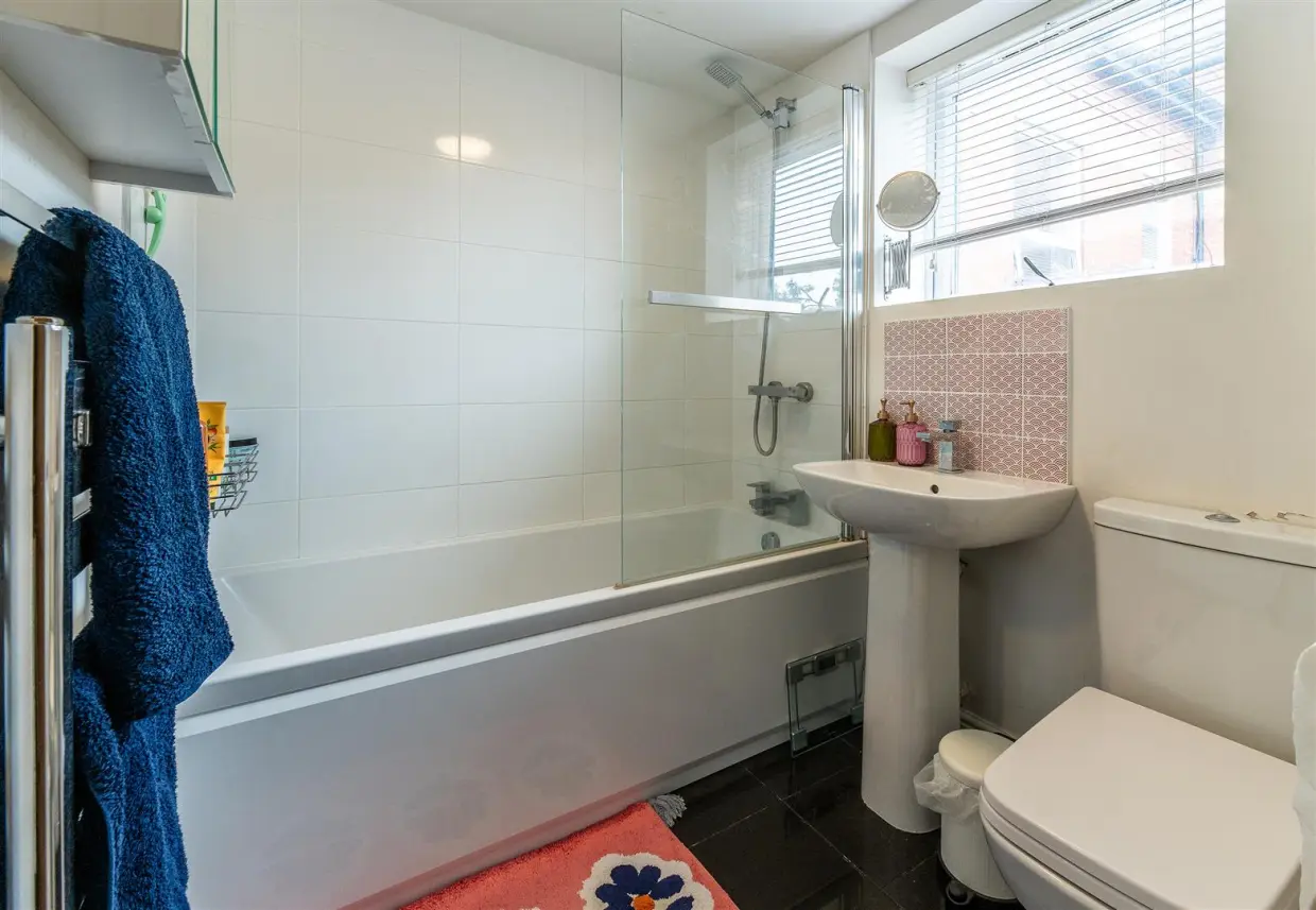 On entering, you are greeted by a spacious hallway, perfect for storing coats and welcoming guests. From here, doors open to the breakfast kitchen, two double bedrooms, and a sleek three-piece white suite bathroom.