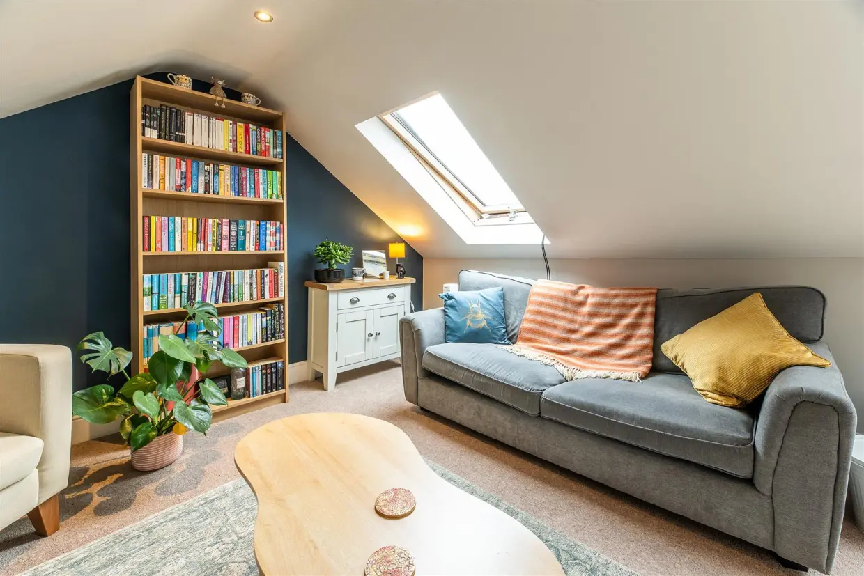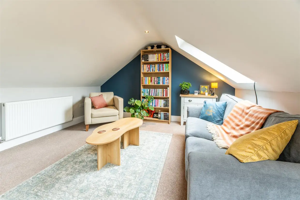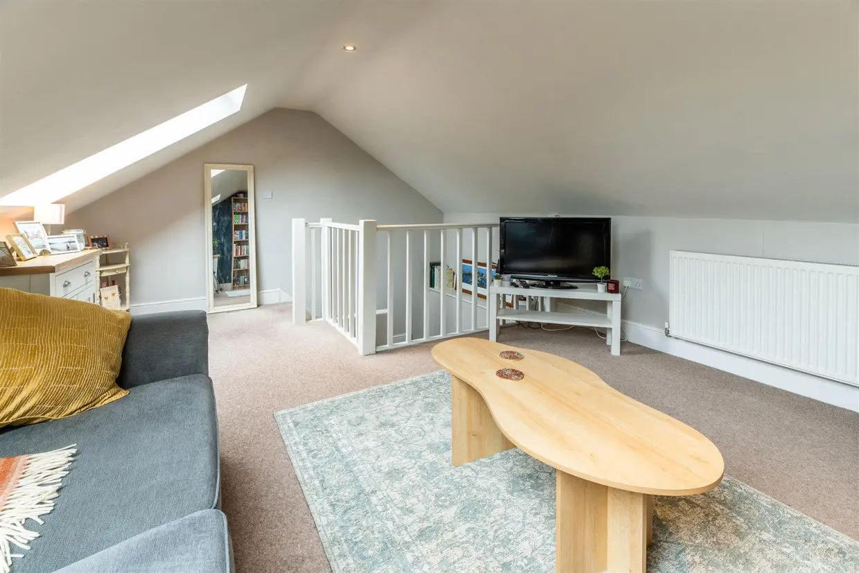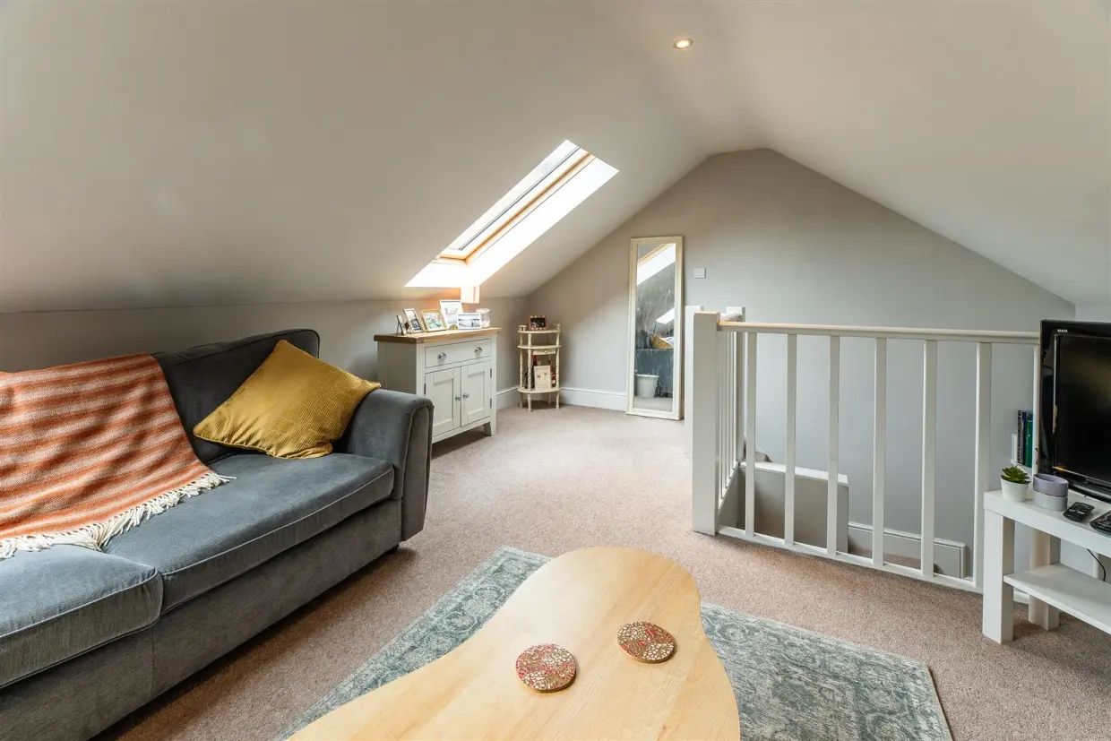 Ascend the stairs to the first floor, where a cosy lounge area awaits. Bathed in natural light from Velux windows at the rear, this space is perfect for relaxation and versatile enough to include a study or additional seating area.