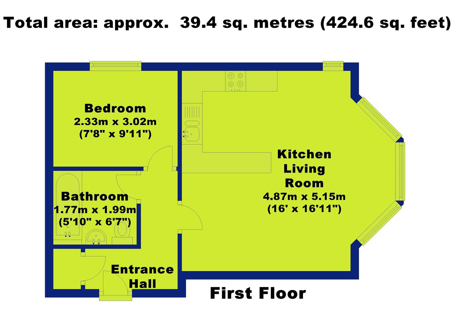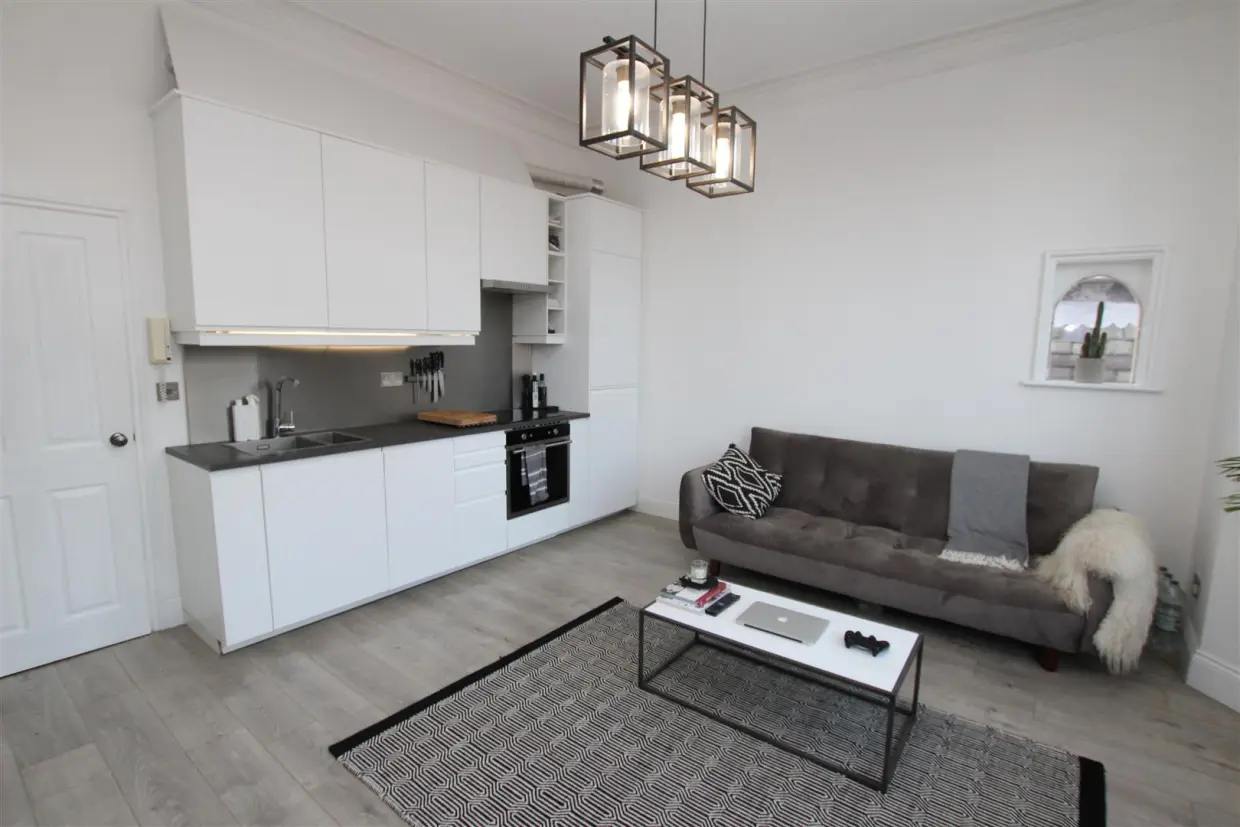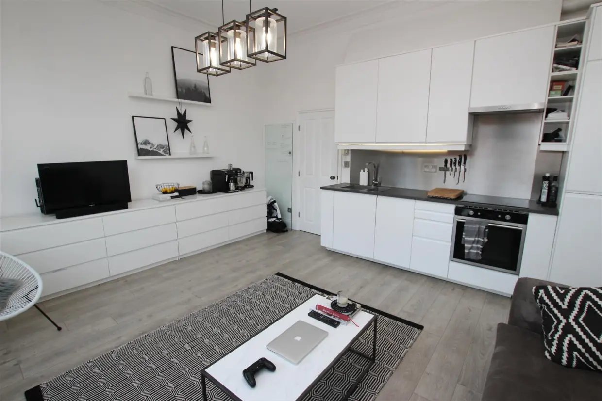 The property is accessed via a grand communal entrance hall, featuring a stunning stained glass window that sets a refined tone. Inside, a private entrance hallway includes a built-in storage cupboard for added convenience. The spacious, light-filled open-plan living area boasts a charming bay window and flows seamlessly into a modern fitted kitchen, complete with sleek units and integrated appliances. A stylish shower room and a well-proportioned double bedroom complete the accommodation.