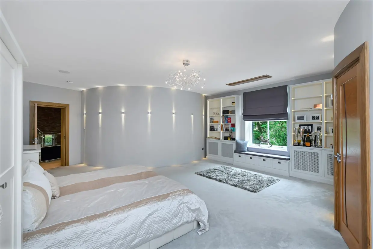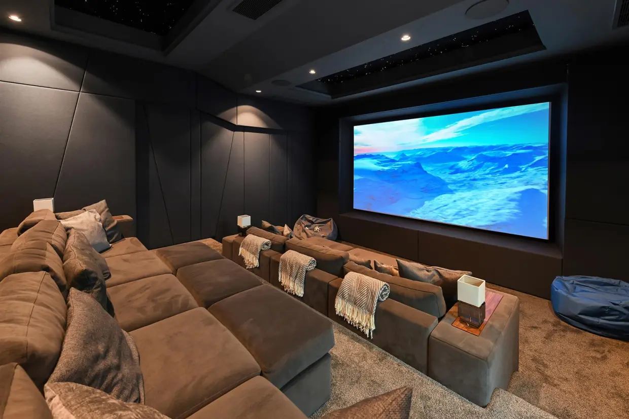 The kitchen is a bespoke designer creation, fitted with Sub-Zero and Wolf appliances, a wine fridge, and premium finishes that combine functionality with elegance. Entertaining is effortless thanks to a state-of-the-art private cinema, complemented by a secret bar hidden behind a sliding door – a touch of playfulness that enhances the home's sense of exclusivity.