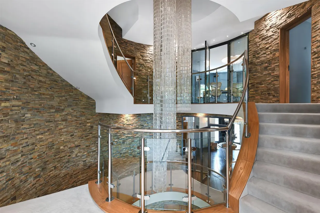 Inside, the home unfolds across eight split-level floors, all designed around a dramatic circular entrance hall that immediately sets the tone for the grandeur within. A dazzling chandelier cascades overhead, while a built-in fish tank creates a striking centrepiece, infusing the entrance with theatre, creativity, and individuality.