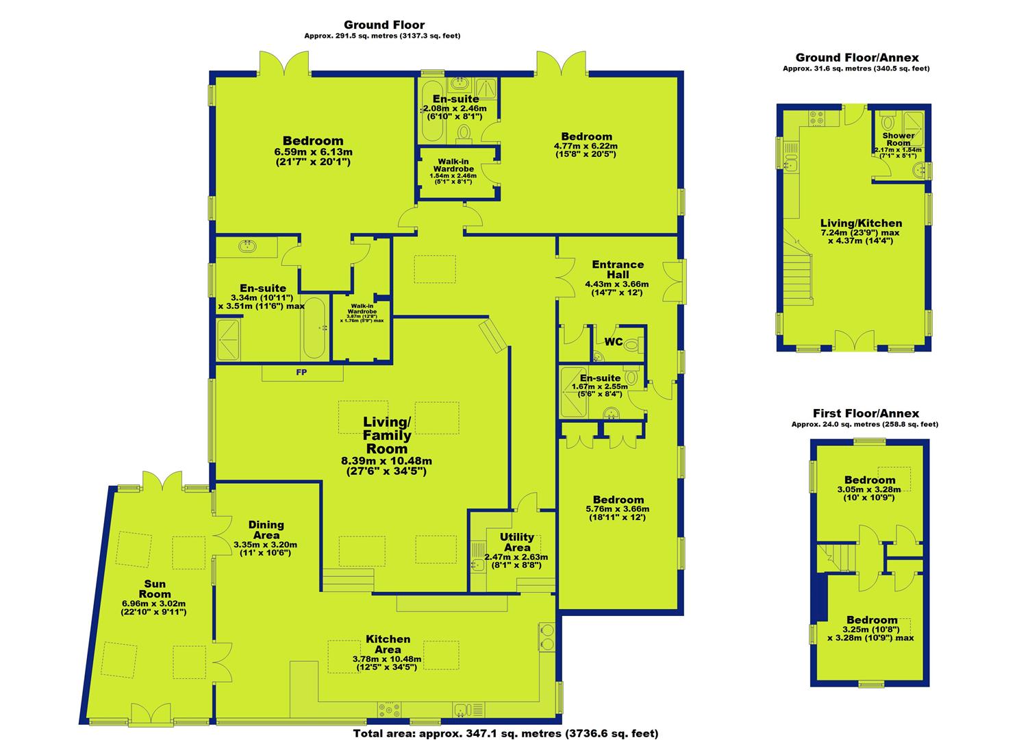 The annex is ideal if you have older children or for guests visiting. The accommodation comprises large open plan living with fitted kitchen and shower room on the ground floor. To the first floor there are two double bedrooms.