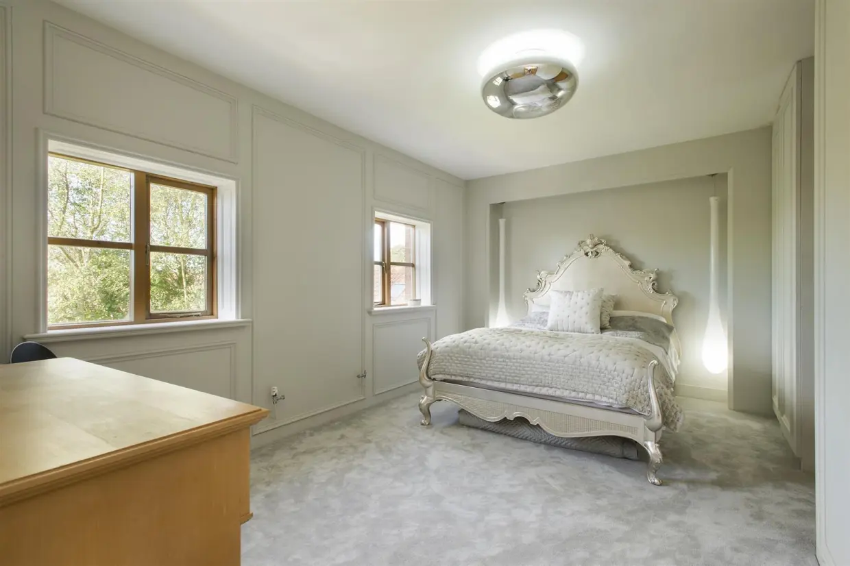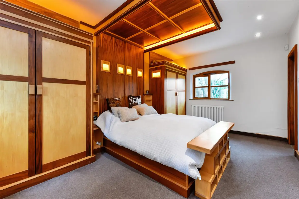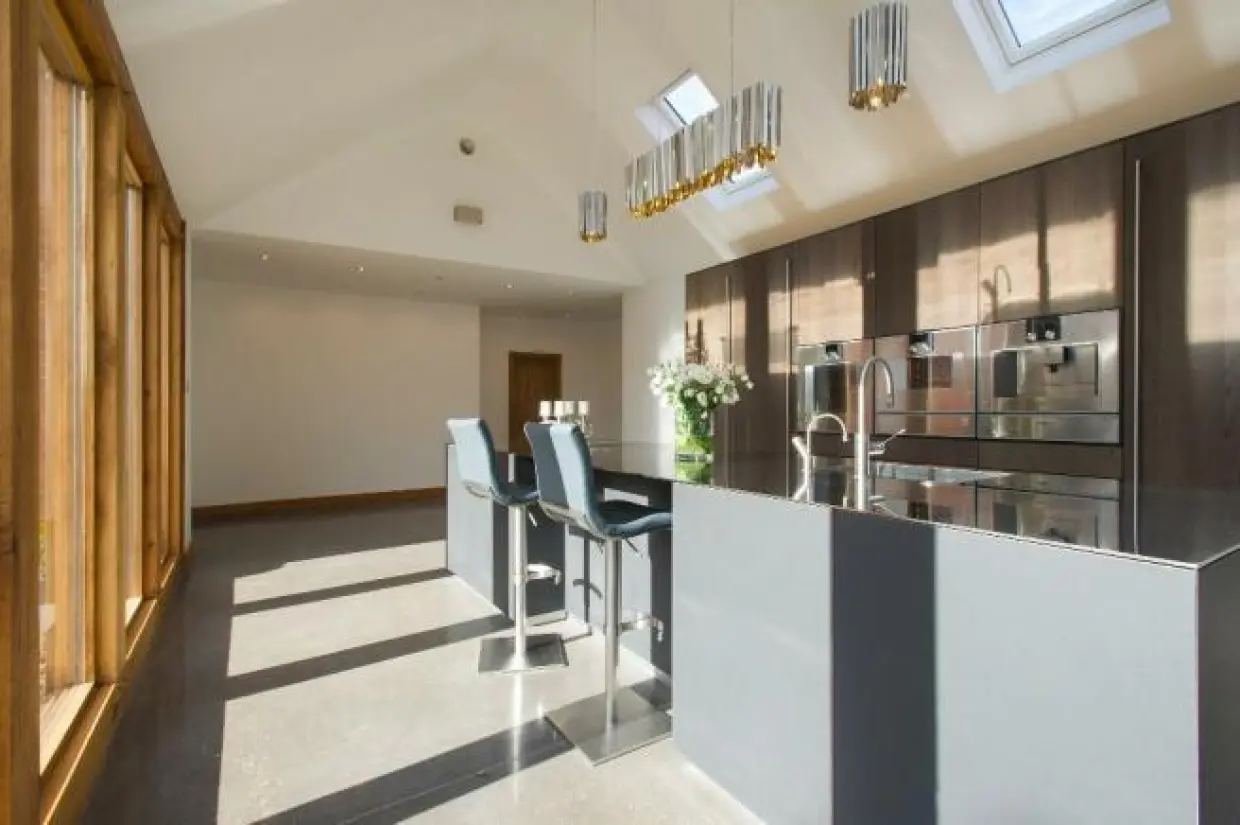 The open-plan Living Room combines elegance and practicality, featuring a Charnwood multi-fuel stove and versatile zones for dining, reading, and relaxing. The recent extension houses a state-of-the-art Family Kitchen with bespoke Italian units, Gaggenau appliances, and a handmade stainless steel island. Features like a Quooker tap, induction hob, and integrated LED lighting make this space a culinary dream and perfect for entertaining.