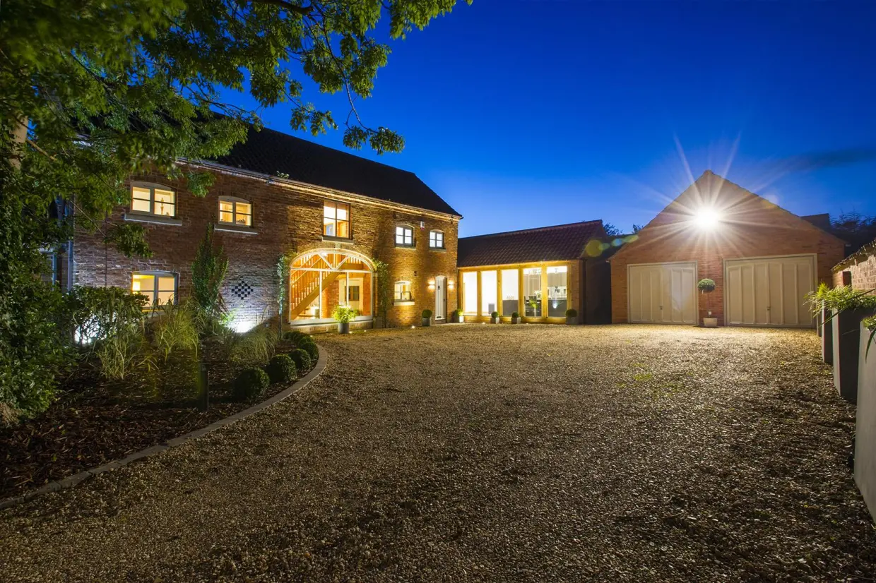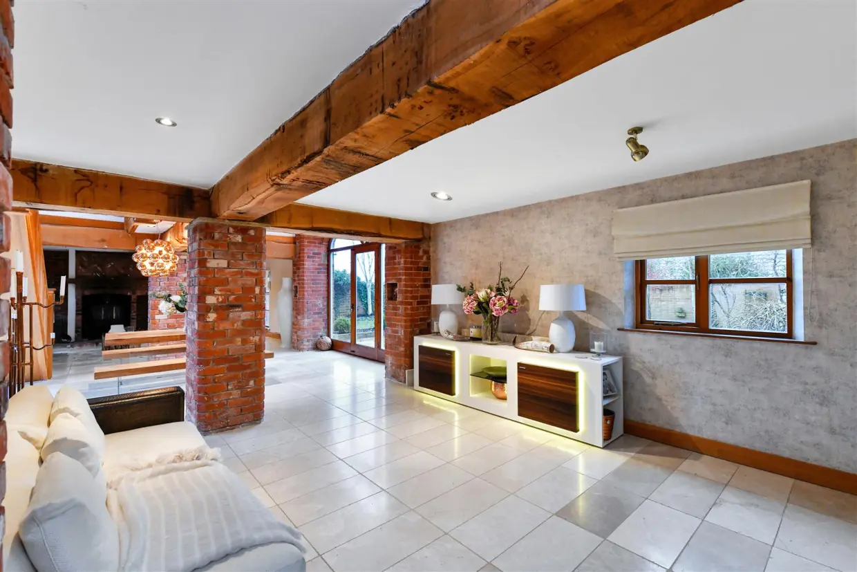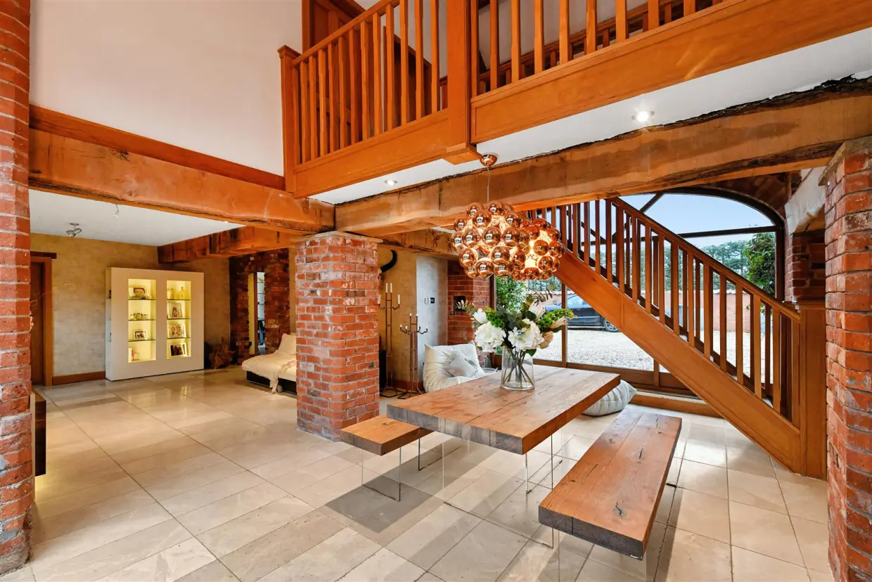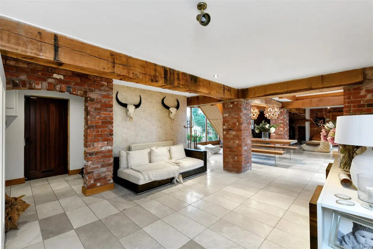 This stunning barn conversion offers a perfect blend of contemporary luxury and period charm, ideally located with easy access to Nottingham, Leicester, and the M1. London is just 90 minutes away via East Midlands Parkway, and East Midlands Airport provides national and international travel options. The area boasts excellent schools and amenities, including a golf club, sports facilities, and the renowned Perkins Bar & Bistro.Behind electric gates, the property opens to a spacious courtyard with parking for six cars, a double garage, and a secluded garden ideal for outdoor dining. Inside, the home impresses with stylish interiors, exposed brickwork, oak beams, underfloor heating, and Porcelanosa marble-tiled floors.