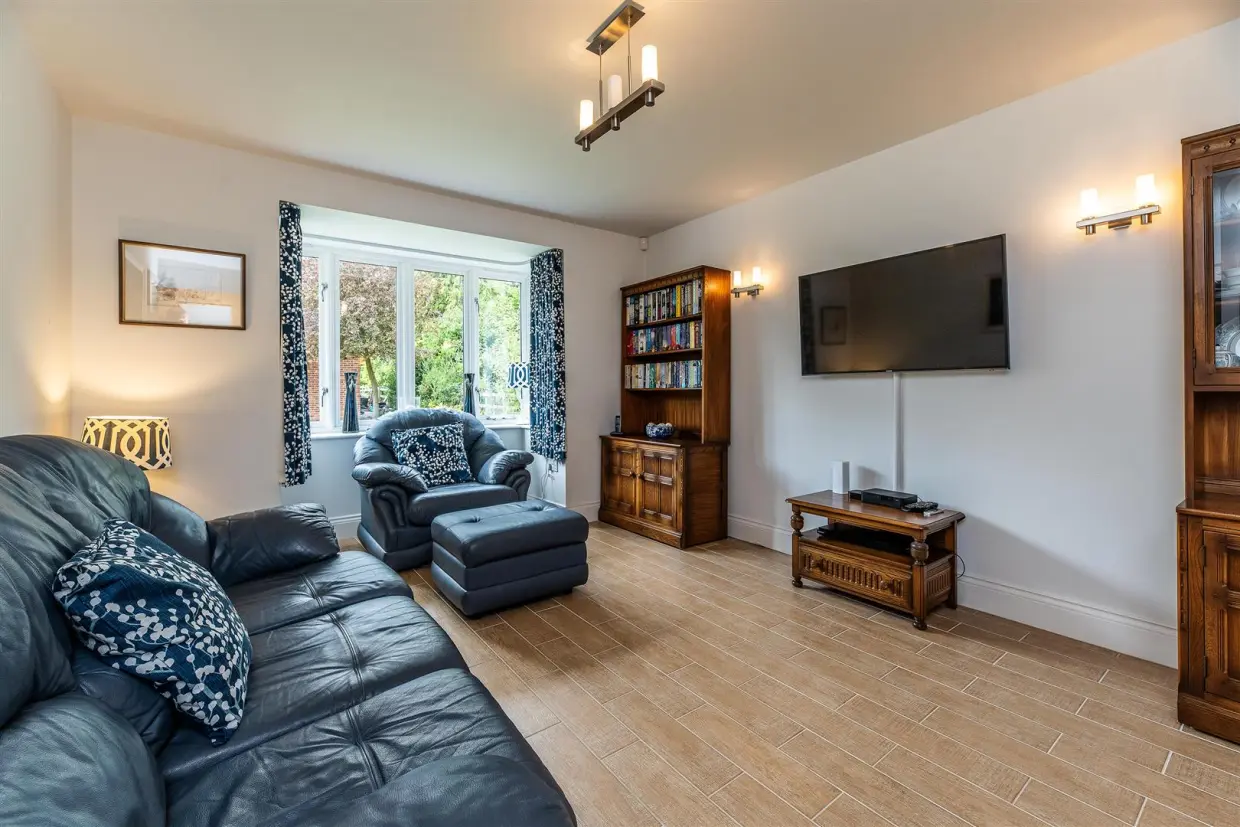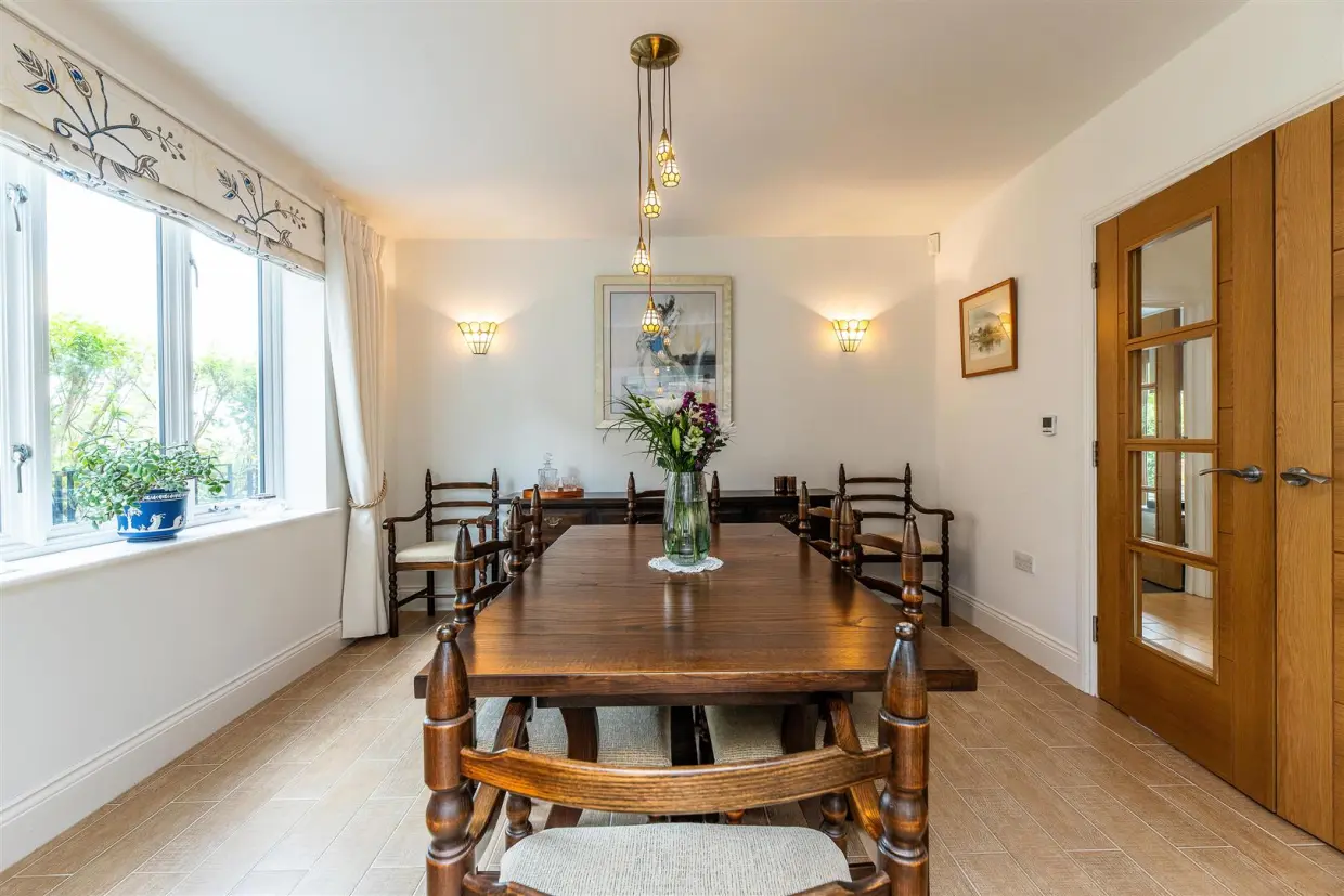 On the opposite side of the hallway is a generous sitting room with a large box bay window overlooking the front garden, underfloor heating, and doors opening into the dining room, which features a side window and double doors leading back into the hallway.