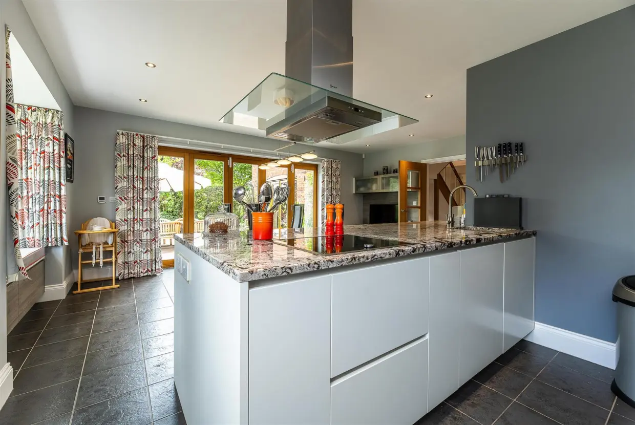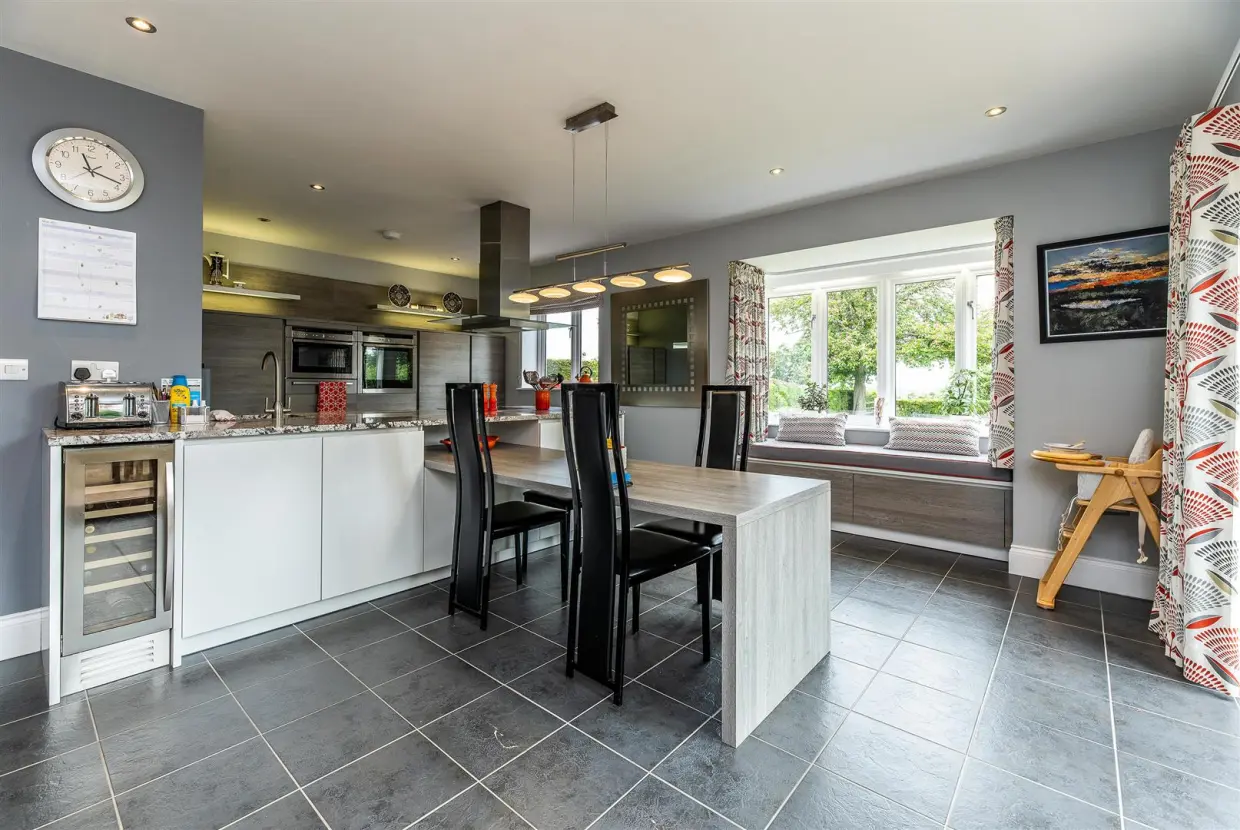 The kitchen is a standout feature, offering views of the landscaped garden. It includes a range of wall and base units with granite worktops, a ceiling-suspended extractor over a ceramic hob, a built-in breakfast table, ceramic tiled flooring with underfloor heating, double-glazed bifold doors to the garden, and a feature box bay window with a seating area.