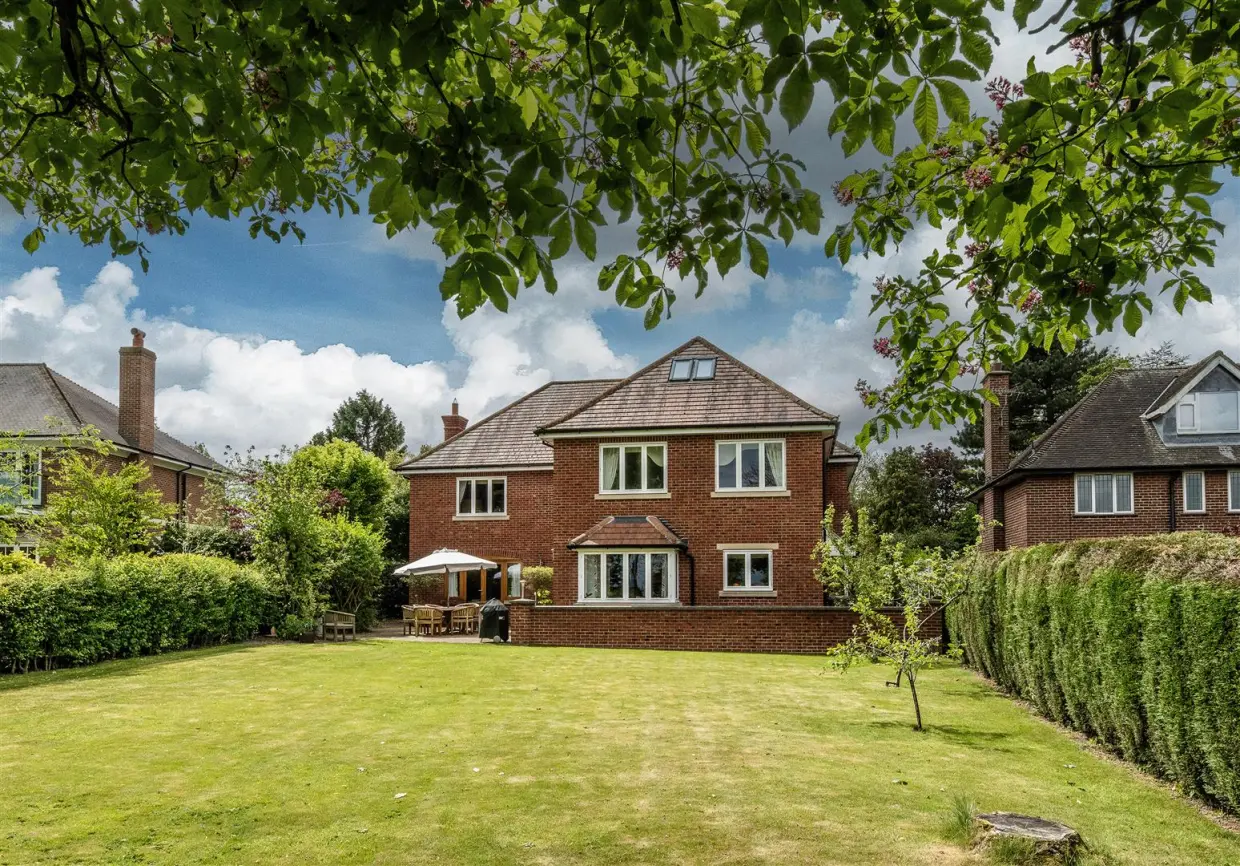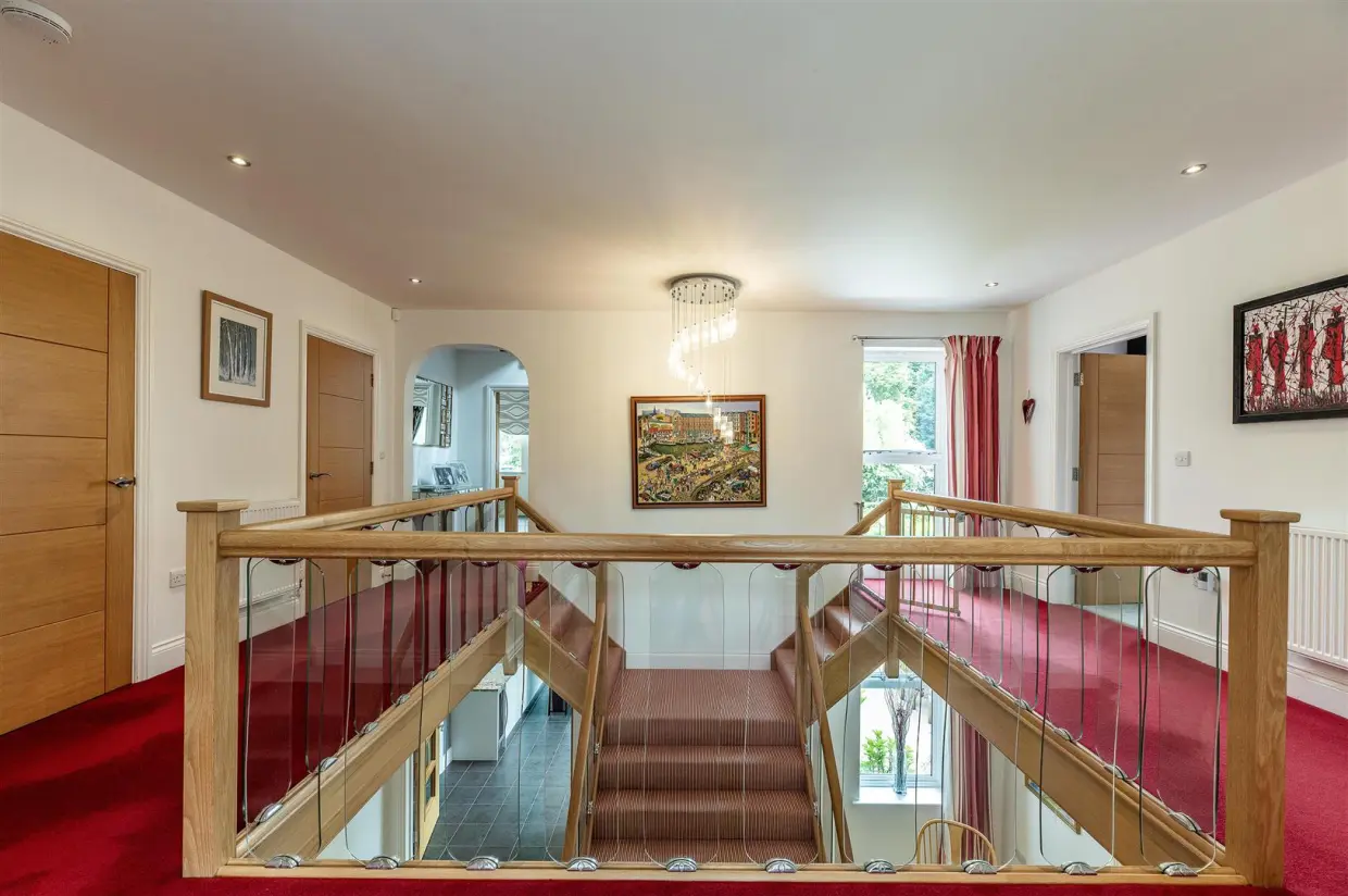 The first floor has a stunning galleried landing with wooden and glass balustrades, a large seating or study area with recessed windows overlooking the garden, and access to four sizable double bedrooms.