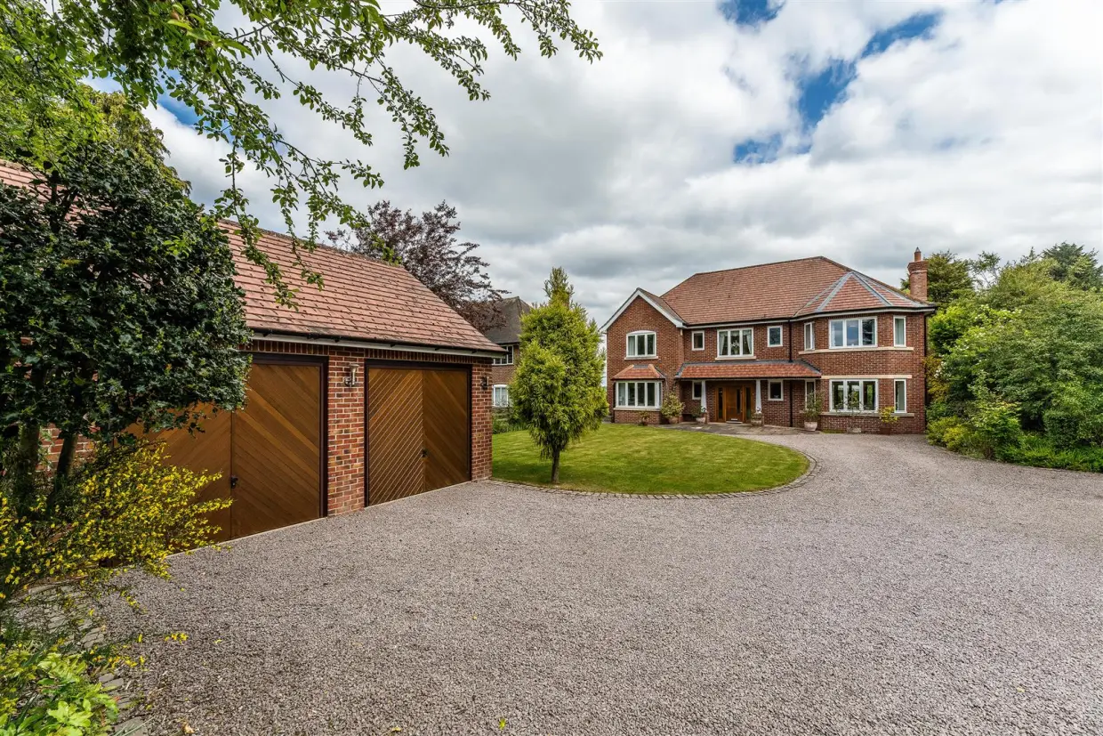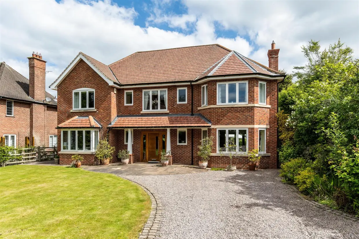 The front garden is beautifully landscaped with well-stocked borders, mature trees, and a large lawn. Gated access leads to the rear.