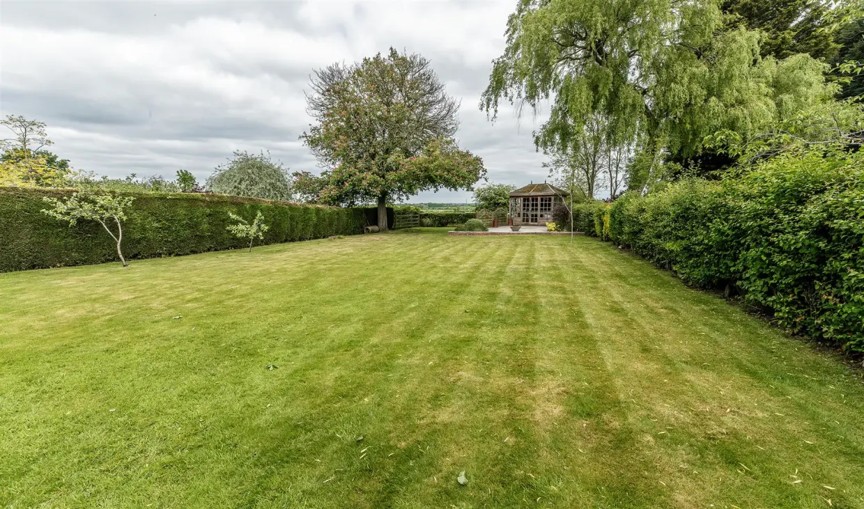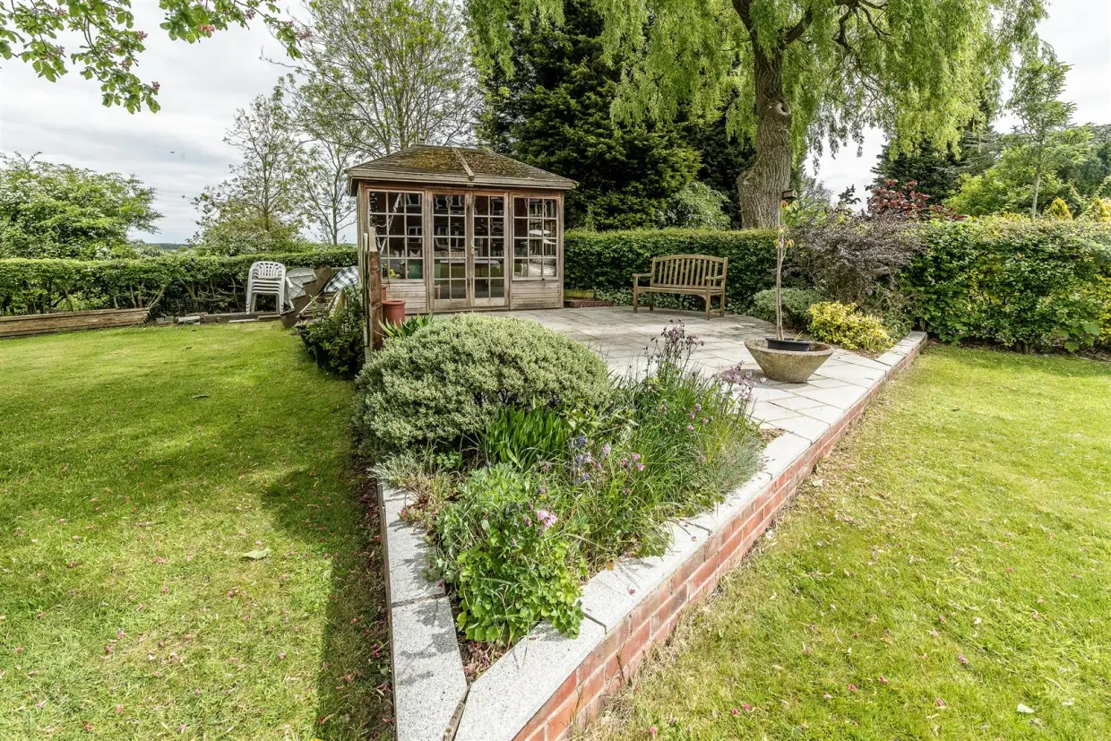 The rear garden features a paved patio accessible from both the kitchen and lounge, offering ideal outdoor entertaining space. The majority of the garden is laid to lawn, with a raised patio seating area leading to a wooden summerhouse. The rear of the property enjoys open views over surrounding fields.