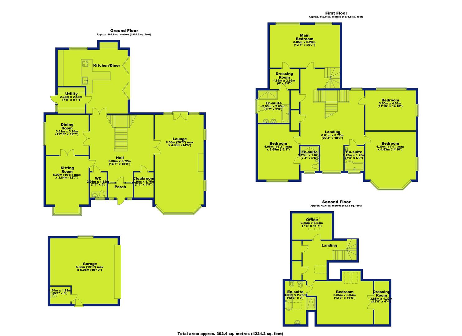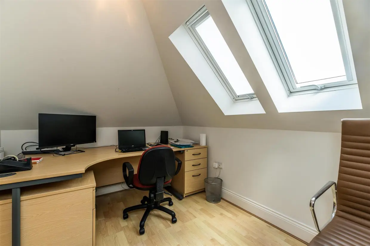 The top floor includes a landing with Velux windows, a fitted office area, built-in storage, and a spacious guest bedroom with garden views, a walk-in dressing room, and a luxurious en-suite bathroom.