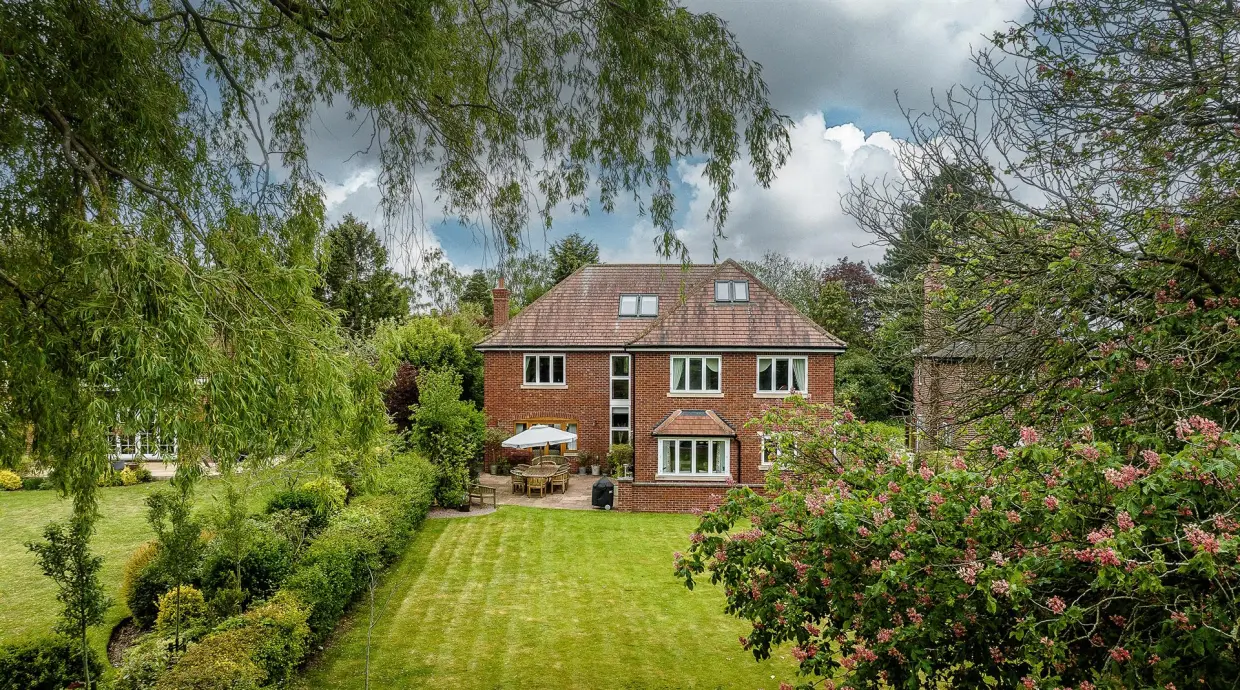 The master bedroom features two windows with garden views, a fully fitted dressing room, and an opulent five-piece en-suite bathroom with his-and-hers basins, a double shower cubicle, a freestanding bath, and WC.