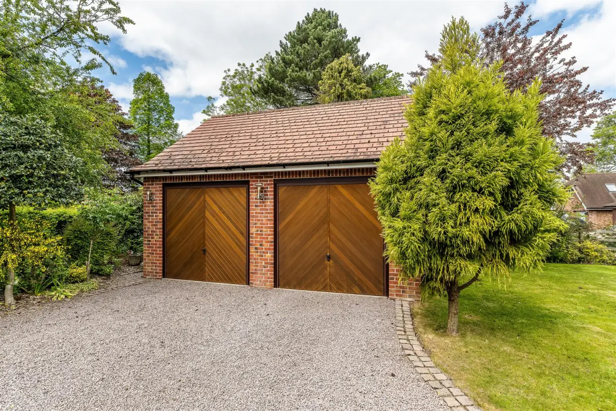 Outside, the property sits behind a gated entrance that opens onto a sweeping gravel driveway leading to the front door and a detached garage with two up-and-over doors and a built-in WC.