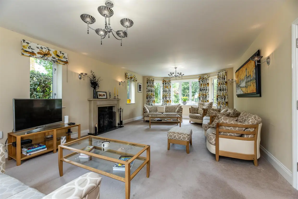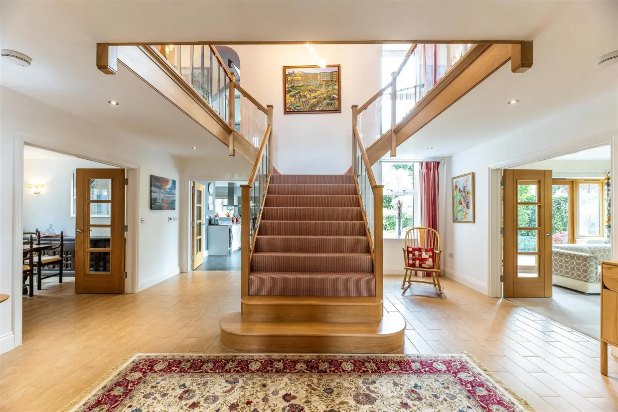 The property is entered through a wooden front door with side lights, opening into an entrance porch with glazed double doors that lead into a breathtaking hallway. The space features a butterfly staircase and a galleried mezzanine landing rising to the second floor. There is a wood-effect tiled floor, a window with views to the rear, and doors opening to various reception areas.The main lounge enjoys a triple aspect with views to the front and rear of the plot. A large double-glazed bay window at the front, along with two additional double-glazed windows flanking a feature fireplace with an open half-stone surround, flood the room with natural light.