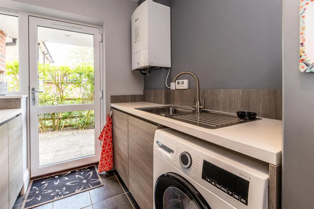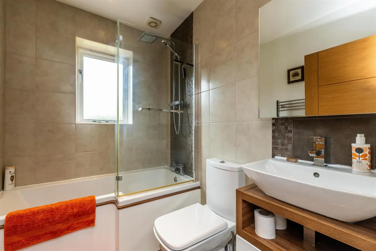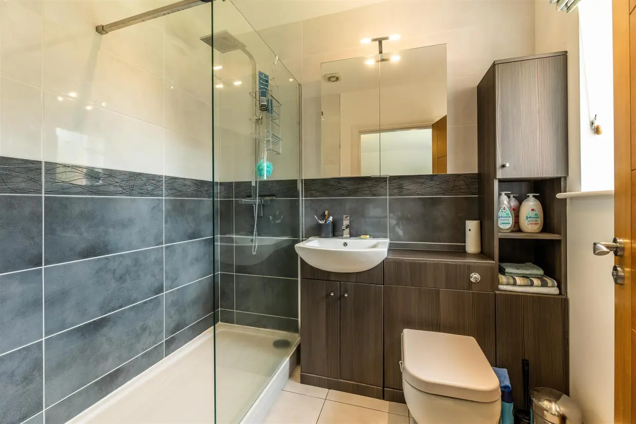 To either side of the front door are a contemporary downstairs WC with a two-piece suite and a built-in cloakroom for storage.