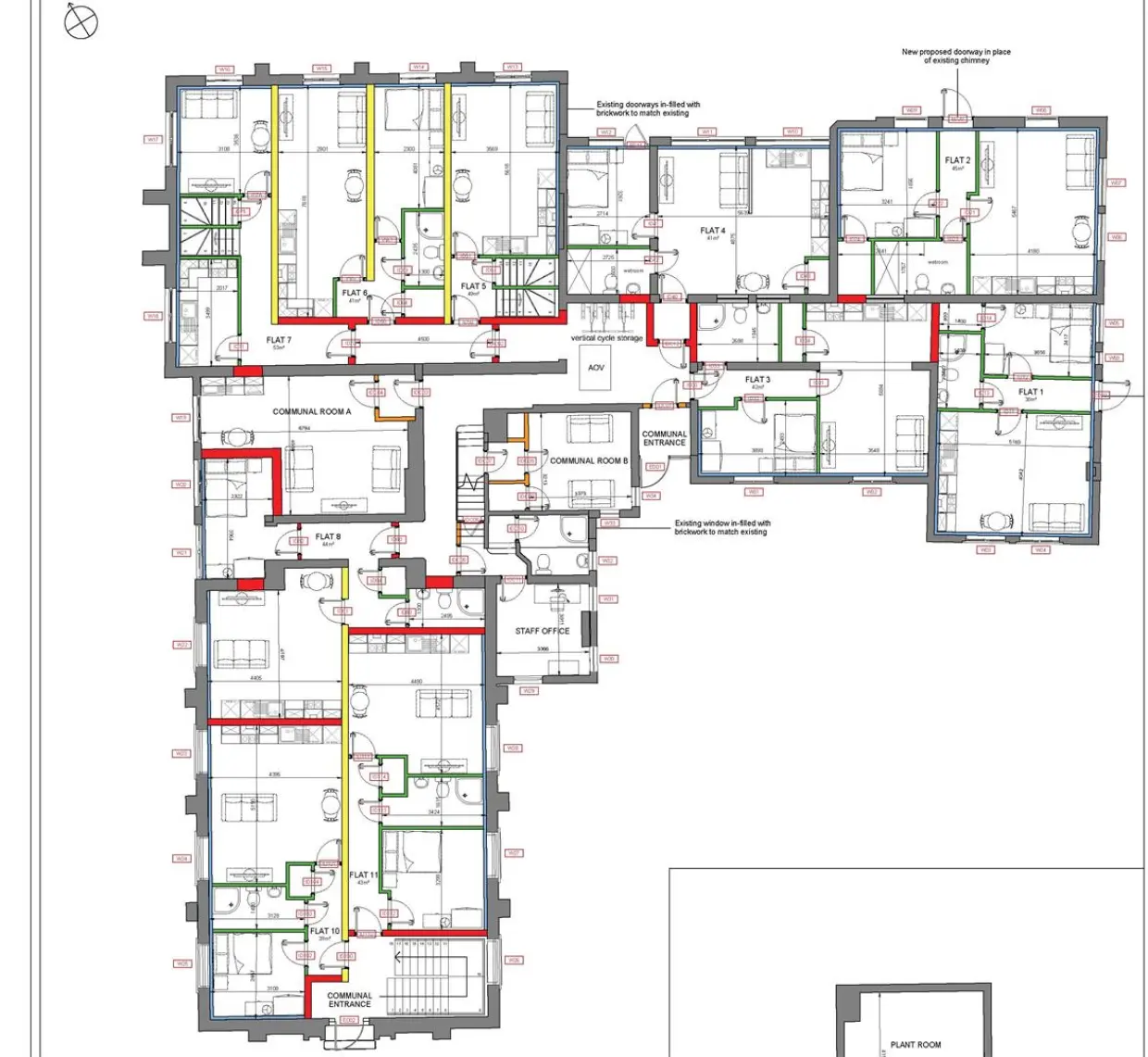 The scheme comprises 13 purpose-designed supported living apartments, together with a staff office, communal lounge, landscaped outdoor areas and on-site parking. Completed to a high supported living specification, the accommodation includes wet rooms, acoustic and thermal upgrades, intercom and CCTV systems, and staff facilities. Energy efficiency measures, including solar PV and MVHR, support EPC ratings of B–C across the units.